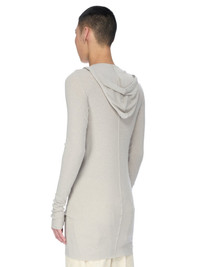 RICK OWENS FW25 CONCORDIANS HOODED RIB LS T IN PEARL RAININO RIB JERSEY THIS HOODED RIB LS T IS BELOW HIP LENGTH WITH A SLIM FIT AND LONG SLEEVES AND A HOOD. IT HAS A RIBBED NECKLINE, RAW CUT HEM AND CUFFS, AND FEATURES THE SIGNATURE SINGLE SEAM RUNNING DOWN CENTRE BACK SPINE THIS MEDIUMWEIGHT AND FLUID VISCOSE AND WOOL BLEND RIB JERSEY HAS A SOFT, WARM HANDFEEL AND A SLIGHTLY HAIRY SURFACE TEXTURE WE STRIVE TO KEEP OUR PRODUCTION AS LOCAL AS POSSIBLE. THE FULL MANUFACTURING CYCLE OF THIS PRODUCT, FROM THE MATERIAL KNITTING TO SEWING AND FINISHING, WAS UNDERTAKEN CLOSE TO OUR HOME BASE IN CONCORDIA, ITALY THIS JERSEY IS MADE FROM FSC® CERTIFIED VISCOSE AND RWS CERTIFIED WOOL COLOR: PEARL MATERIAL: 30% VISCOSE + 30% NYLON + 20% ANGORA + 20% WOOL MODEL IS 189CM TALL MODEL WEARS SIZE S