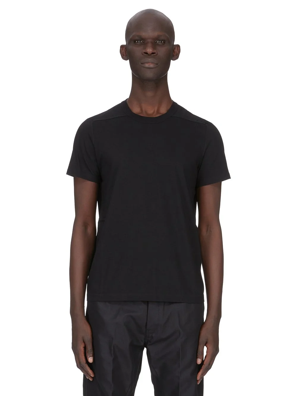 RICK OWENS SS26 TEMPLE SHORT LEVEL T IN BLACK CLASSIC COTTON JERSEY THIS SHORT LEVEL T IS ABOVE-HIP LENGTH WITH SHORT SLEEVES AND A RIBBED CREW NECK. IT FEATURES SIGNATURE FRONT LEVEL SHOULDER SEAMS AND SINGLE SEAM RUNNING DOWN THE CENTER BACK SPINE THIS MEDIUMWEIGHT CLASSIC COTTON JERSEY IS COMPACT WITH A DRY HANDFEEL THIS JERSEY IS MADE USING GOTS CERTIFIED ORGANIC COTTON WHICH MEANS THE NATURAL FIBER IS GROWN WITHOUT HARMFUL CHEMICALS, LEAVING OUR SOIL, AIR AND WATER CLEANER FROM CONTAMINATES WE STRIVE TO KEEP OUR PRODUCTION AS LOCAL AS POSSIBLE. THE FULL MANUFATURING CYCLE OF THIS PRODUCT, FROM THE MATERIAL KNITTING TO SEWING AND FINISHING, WAS UNDERTAKEN CLOSE TO OUR HOME BASE IN CONCORDIA, ITALY COLOR: BLACK MATERIAL:100% COTTON MODEL IS 189CM TALL MODEL WEARS SIZE S