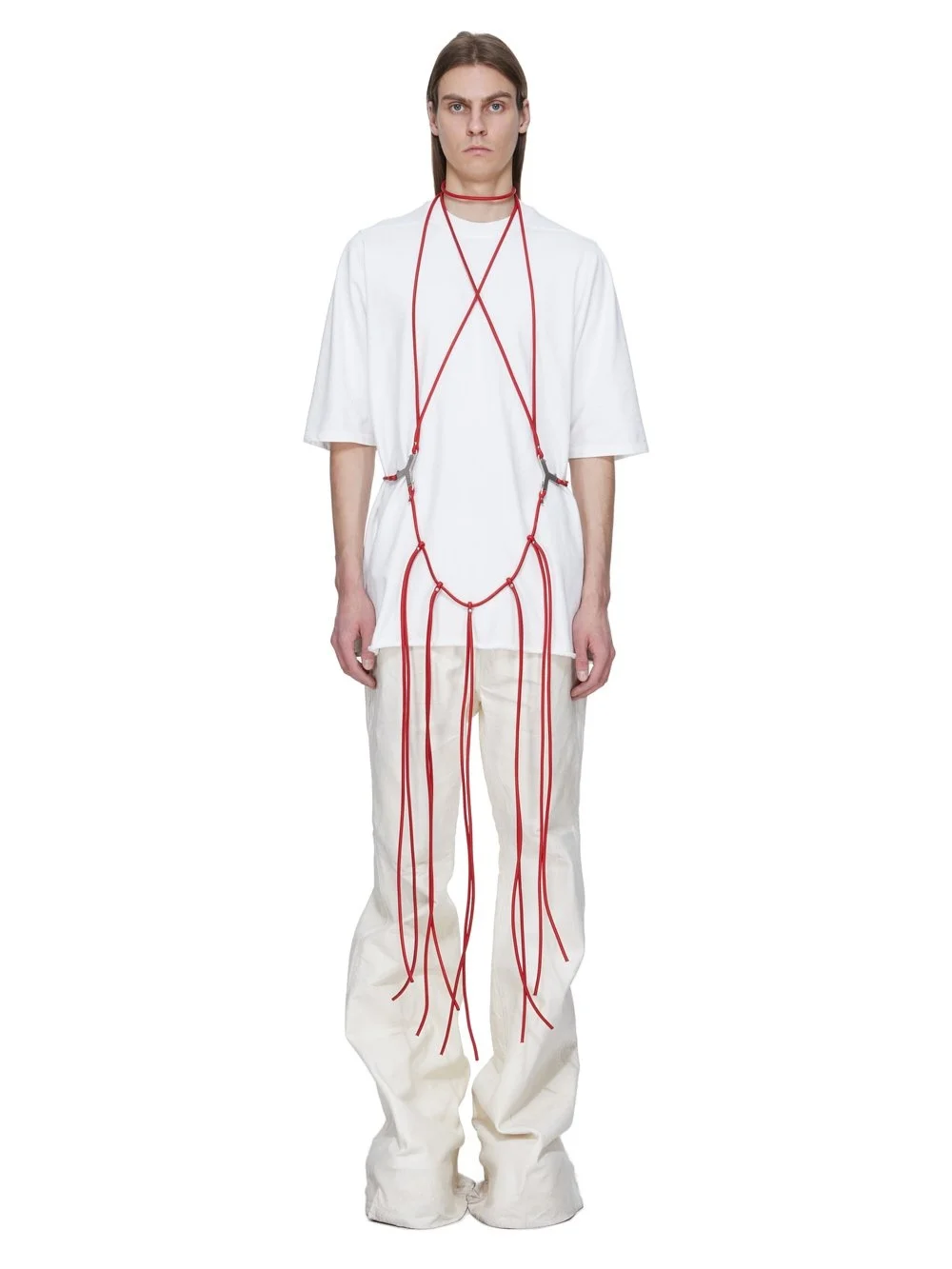 RICK OWENS FW25 CONCORDIANS RUNWAY CORD TANK FRINGED IN CARNELIAN BUTTER CALF LEATHER THIS CORD TANK IS MADE FROM SEVERAL CORDS GOING AROUND THE NECK AND CROSSING OVER THE CHEST AND AROUND THE WAIST. THEY ARE LINKED TOGETHER BY TWO SMALL CERBERUS KEYCHAINS THAT FEATURE A TRIPLE-SIDED SNAP HOOK, ENGRAVED WITH THE RICK OWENS LOGO. THIS VERSION FEATURES LEATHER FRINGES, ATTACHED WITH RIVETS, FALLING FROM THE FRONT WAIST TO BELOW KNEE THIS LIGHTWEIGHT FULL GRAIN CALF LEATHER IS FINISHED ONLY USING ANALINE AND NATURAL OILS IN ORDER TO ACHIEVE ITS BUTTERY AND SEMI SHINY SURFACE COLOR: CARNELIAN MATERIAL:100% CALF LEATHER MODEL IS 189CM TALL MODEL WEARS SIZE S