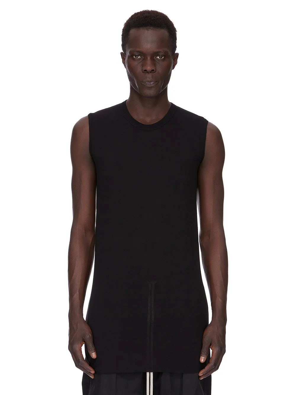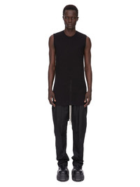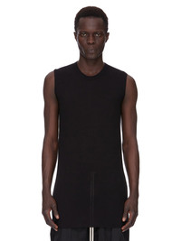 RICK OWENS FOREVER BASIC SL T IN BLACK VISCOSE SILK JERSEY THIS BASIC SL T IS BELOW HIP LENGTH AND SLEEVELESS. IT HAS A RIBBED ROUND NECK, RAW CUT HEM AND REINFORCED RAW SHOULDERS. IT FEATURES THE SIGNATURE SINGLE SEAM RUNNING DOWN THE CENTRE BACK SPINE THIS LIGHTWEIGHT VISCOSE AND SILK JERSEY HAS A SOFT AND DRAPEY HANDFEEL. THIS JERSEY IS MADE FROM FSC® CERTIFIED VISCOSE WHICH ENSURES THAT THE FIBERS ARE PRODUCED FROM RESPONSIBLY MANAGED SOURCES AND NO DEFORESTATION OCCURS WE STRIVE TO KEEP OUR PRODUCTION AS LOCAL AS POSSIBLE. THE FULL MANUFACTURING CYCLE OF THIS PRODUCT, FROM THE MATERIAL KNITTING TO SEWING AND FINISHING, WAS UNDERTAKEN CLOSE TO OUR HOME BASE IN CONCORDIA, ITALY. - COLOR:BLACK - MATERIAL: 88% VISCOSE + 12% SILK - MODEL IS WEARING SIZE S - MODEL IS 189 CM TALL