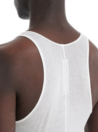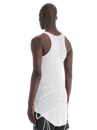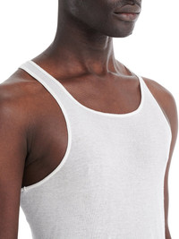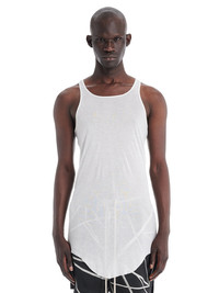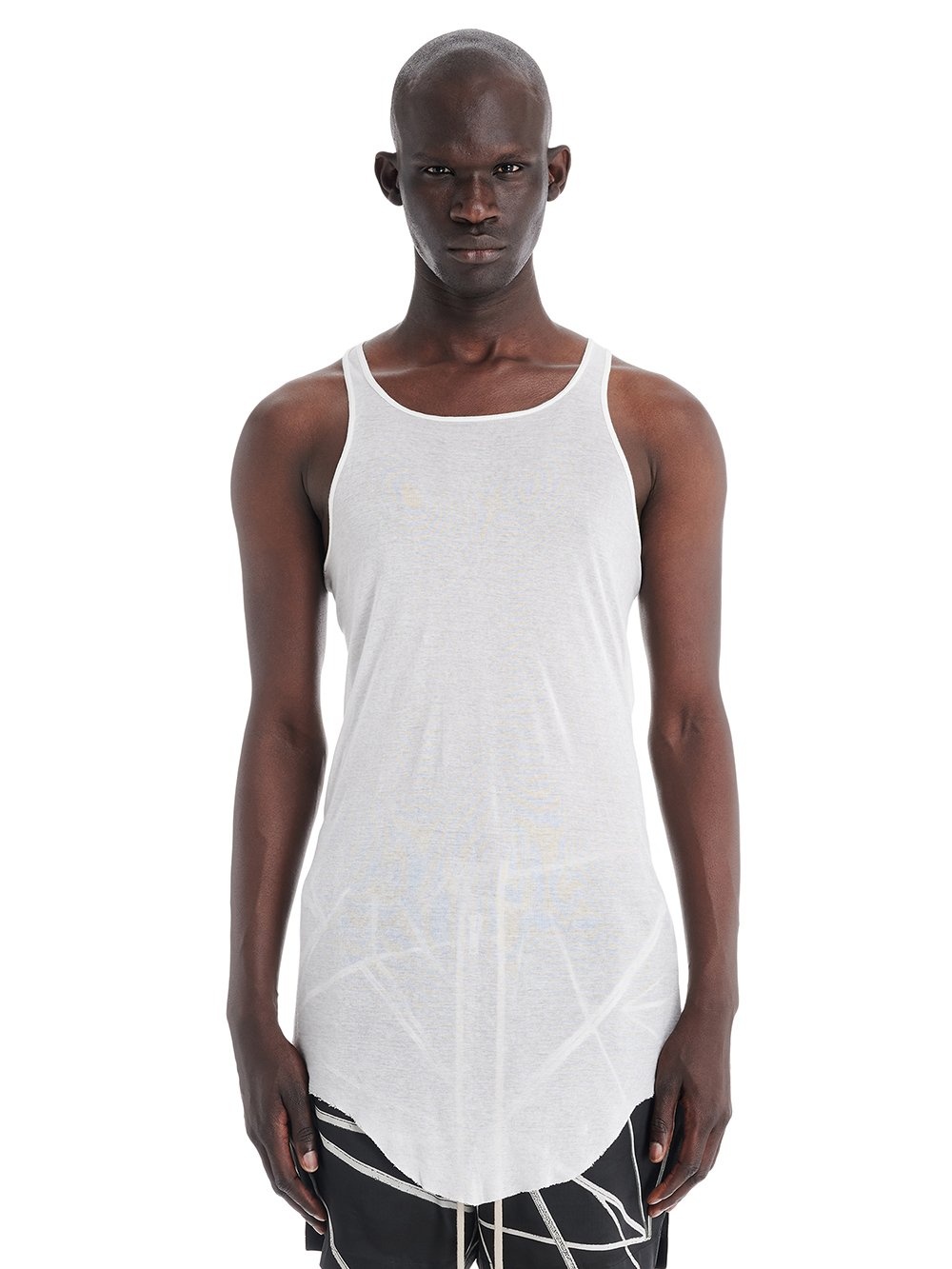 RICK OWENS SS22 FOGACHINE BASIC RIB TANK IN MINI RIB JERSEY THIS BASIC RIB TANK IS HIP LENGTH WITH A ROUNDED RAW CUT HEM THAT DIPS IN FRONT AND BACK. IT HAS AN ROUND NECKLINE AND THIN SHOULDER STRAPS THAT FLOW INTO AN SLIGHT RACER BACK. IT FEATURES THE SIGNATURE SINGLE SEAM RUNNING DOWN THE CENTRE BACK SPINE THIS MINI RIB TEXTURED JERSEY IS MADE USING GOTS CERTIFIED ORGANIC COTTON BECAUSE IT MEANS THE NATURAL FIBER IS GROWN WITHOUT HARMFUL CHEMICALS, WHICH LEAVES OUR SOIL, AIR AND WATER CLEANER FROM CONTAMINATES. WE STRIVE TO KEEP OUR PRODUCTION AS LOCAL AS POSSIBLE. THE FULL MANUFACTURING CYCLE OF THIS PRODUCT, FROM THE MATERIAL KNITTING TO SEWING AND FINISHING, WAS UNDERTAKEN CLOSE TO OUR HOME BASE IN CONCORDIA, ITALY - COLOR: MILK WHITE - MATERIAL: 100% COTTON. - MODEL IS WEARING SIZE S - MODEL IS 189 CM TALL
