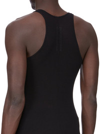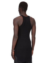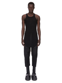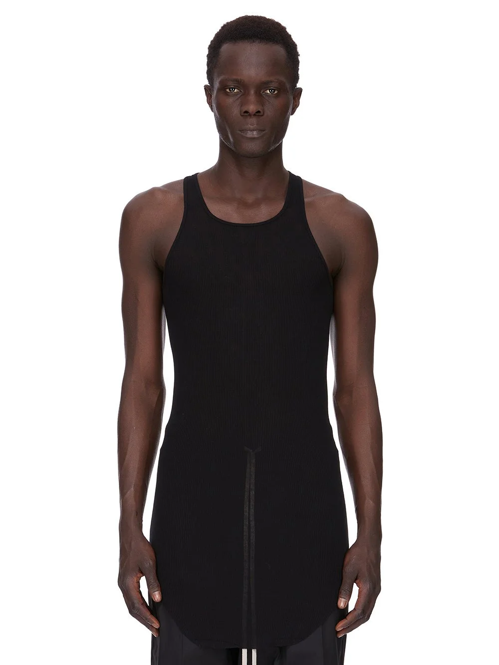 RICK OWENS FOREVER BASIC RIB TANK IN BLACK VISCOSE SILK RIB JERSEY THIS BASIC RIB TANK IS HIP LENGTH WITH A ROUNDED RAW CUT HEM THAT DIPS IN FRONT AND BACK. IT HAS A ROUND NECKLINE AND THIN SHOULDER STRAPS THAT FLOW INTO A SLIGHT RACER BACK. IT FEATURES THE SIGNATURE SINGLE SEAM RUNNING DOWN THE CENTRE BACK SPINE THIS LIGHTWEIGHT VISCOSE AND SILK RIB JERSEY HAS A DISTINCT RIB PATTERN AND SOFT HANDFEEL. THIS JERSEY IS MADE FROM FSC® CERTIFIED VISCOSE WHICH ENSURES THAT THE FIBERS ARE PRODUCED FROM RESPONSIBLY MANAGED SOURCES AND NO DEFORESTATION OCCURS WE STRIVE TO KEEP OUR PRODUCTION AS LOCAL AS POSSIBLE. THE FULL MANUFACTURING CYCLE OF THIS PRODUCT, FROM THE MATERIAL KNITTING TO SEWING AND FINISHING, WAS UNDERTAKEN CLOSE TO OUR HOME BASE IN CONCORDIA, ITALY. - COLOR:BLACK - MATERIAL: 88% VISCOSE + 12% SILK - MODEL IS WEARING SIZE S - MODEL IS 189 CM TALL