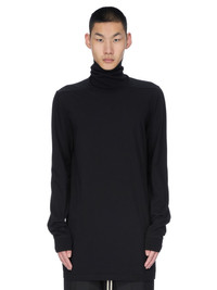 RICK OWENS FW25 CONCORDIANS SURF T IN BLACK CLASSIC COTTON JERSEY THIS SURF T IS BELOW HIP LENGTH WITH LONG SLEEVES AND A LOOSE FIT. IT HAS A HIGH RIBBED TURTLE NECK AND CUFFS. IT FEATURES THE SIGNATURE LEVEL SHOULDER SEAMS AND SINGLE SEAM RUNNING DOWN THE CENTRE BACK SPINE THIS MEDIUMWEIGHT CLASSIC COTTON JERSEY IS COMPACT WITH A DRY HANDFEEL THIS JERSEY IS MADE USING GOTS CERTIFIED ORGANIC COTTON WHICH MEANS THE NATURAL FIBER IS GROWN WITHOUT HARMFUL CHEMICALS, LEAVING OUR SOIL, AIR AND WATER CLEANER FROM CONTAMINATES WE STRIVE TO KEEP OUR PRODUCTION AS LOCAL AS POSSIBLE. THE FULL MANUFACTURING CYCLE OF THIS PRODUCT, FROM THE MATERIAL KNITTING TO SEWING AND FINISHING, WAS UNDERTAKEN CLOSE TO OUR HOME BASE IN CONCORDIA, ITALY COLOR: BLACK MATERIAL: 100% COTTON MODEL IS 189CM TALL MODEL WEARS SIZE S