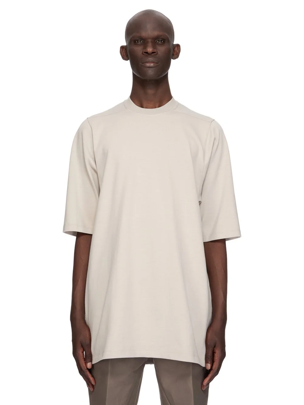 RICK OWENS SS26 TEMPLE JUMBO SS T IN PEARL HEAVY JERSEY THIS JUMBO SS T IS BELOW-HIP LENGTH WITH AN OVERSIZED FIT. IT HAS A RIBBED CREWNECK AND ELBOW-LENGTH SHORT SLEEVES. IT FEATURES SIGNATURE FRONT LEVEL SHOULDER SEAMS AND A CENTER BACK SEAM THIS HEAVYWEIGHT JERSEY IS COMPACT WITH A DRY HANDFEEL THIS JERSEY IS MADE USING GOTS CERTIFIED ORGANIC COTTON WHICH MEANS THE NATURAL FIBER IS GROWN WITHOUT HARMFUL CHEMICALS, LEAVING OUR SOIL, AIR AND WATER CLEANER FROM CONTAMINATES COLOR: PEARL MATERIAL:100% COTTON MODEL IS 189CM TALL MODEL WEARS SIZE S
