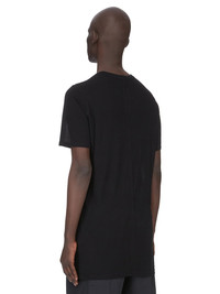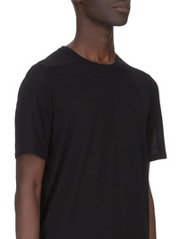 RICK OWENS SS26 TEMPLE LEVEL T IN BLACK VISCOSE SILK JERSEY THIS LEVEL T IS HIP LENGTH WITH SHORT SLEEVES AND A RIBBED ROUND CREWNECK. IT FEATURES THE SIGNATURE LEVEL SHOULDER SEAMS AND SINGLE SEAM RUNNING DOWN THE CENTER BACK SPINE THIS LIGHTWEIGHT AND FLUID VISCOSE AND SILK JERSEY HAS A SOFT HANDFEEL THIS FABRIC IS MADE FROM FSC® CERTIFIED (FSC – C162846) ACETATE WHICH ENSURES THAT THE FIBERS ARE PRODUCED FROM RESPONSIBLY MANAGED SOURCES AND NO DEFORESTATION OCCURS WE STRIVE TO KEEP OUR PRODUCTION AS LOCAL AS POSSIBLE. THE FULL MANUFATURING CYCLE OF THIS PRODUCT, FROM THE MATERIAL KNITTING TO SEWING AND FINISHING, WAS UNDERTAKEN CLOSE TO OUR HOME BASE IN CONCORDIA, ITALY COLOR: BLACK MATERIAL:88% VISCOSE + 12% SILK MODEL IS 189CM TALL MODEL WEARS SIZE S
