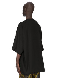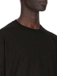 RICK OWENS SS25 HOLLYWOOD TOMMY T IN BLACK CLASSIC COTTON JERSEY THIS TOMMY T IS BELOW-HIP LENGTH WITH A JUMBO OVERSIZED FIT. IT HAS WIDE, SHORT SLEEVES WITH A DROPPED ARMHOLE AND A RIBBED CREWNECK. IT FEATURES SIGNATURE FRONT LEVEL SHOULDER SEAMS THIS MEDIUMWEIGHT CLASSIC COTTON JERSEY IS COMPACT WITH A DRY HANDFEEL. THIS JERSEY IS MADE USING GOTS CERTIFIED ORGANIC COTTON WHICH MEANS THE NATURAL FIBER IS GROWN WITHOUT HARMFUL CHEMICALS, LEAVING OUR SOIL, AIR AND WATER CLEANER FROM CONTAMINATES WE STRIVE TO KEEP OUR PRODUCTION AS LOCAL AS POSSIBLE. THE FULL MANUFACTURING CYCLE OF THIS PRODUCT, FROM THE MATERIAL KNITTING TO SEWING AND FINISHING, WAS UNDERTAKEN CLOSE TO OUR HOME BASE IN CONCORDIA, ITALY. COLOR: BLACK MATERIAL: 100% COTTON MODEL IS 189CM TALL ITEM IS AVAILABLE IN ONE SIZE