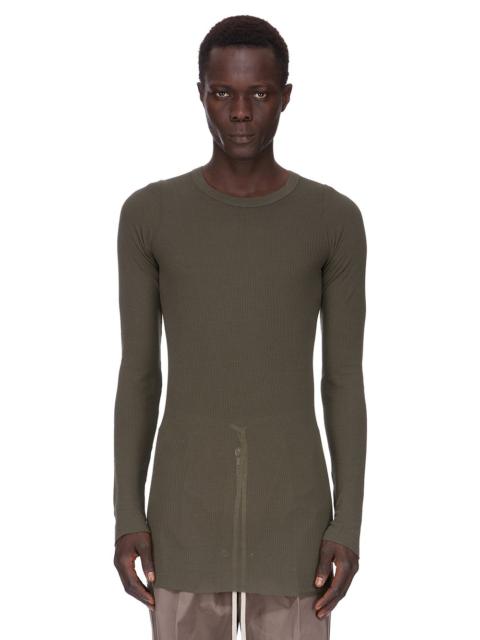 RICK OWENS FW25 CONCORDIANS RIB LS T IN WASHED INDIGO VISCOSE SILK RIB JERSEY THIS RIB LS T IS BELOW HIP LENGTH WITH A SLIM FIT AND LONG SLEEVES. IT HAS A RIBBED ROUND NECK, RAW CUT HEM AND CUFFS, AND FEATURES THE SIGNATURE SINGLE SEAM RUNNING DOWN CENTRE BACK SPINE THIS LIGHTWEIGHT VISCOSE AND SILK RIB JERSEY HAS A DISTINCT RIB PATTERN AND SOFT HANDFEEL THIS JERSEY IS MADE FROM FSC® CERTIFIED VISCOSE WHICH ENSURES THAT THE FIBERS ARE PRODUCED FROM RESPONSIBLY MANAGED SOURCES AND NO DEFORESTATION OCCURS WE STRIVE TO KEEP OUR PRODUCTION AS LOCAL AS POSSIBLE. THE FULL MANUFACTURING CYCLE OF THIS PRODUCT, FROM THE MATERIAL KNITTING TO SEWING AND FINISHING, WAS UNDERTAKEN CLOSE TO OUR HOME BASE IN CONCORDIA, ITALY COLOR: WASHED INDIGO MATERIAL: 88% VISCOSE + 12% SILK MODEL IS 189CM TALL MODEL WEARS SIZE S