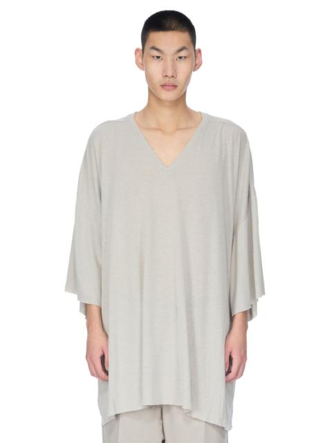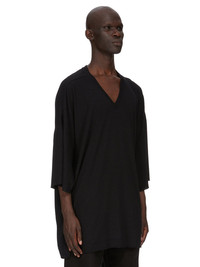 RICK OWENS FW25 CONCORDIANS V TOMMY T IN BLACK RAININO JERSEY THIS V TOMMY T IS BELOW HIP LENGTH WITH A JUMBO OVERSIZED FIT. IT HAS WIDE SHORT SLEEVES WITH A DROPPED ARMHOLE, RAW CUT HEMS AND A V NECK. IT FEATURES SIGNATURE FRONT LEVEL SHOULDER SEAMS THIS MEDIUMWEIGHT AND FLUID VISCOSE AND WOOL BLEND JERSEY HAS A SOFT, WARM HANDFEEL AND A SLIGHTLY HAIRY SURFACE TEXTURE WE STRIVE TO KEEP OUR PRODUCTION AS LOCAL AS POSSIBLE. THE FULL MANUFACTURING CYCLE OF THIS PRODUCT, FROM THE MATERIAL KNITTING TO SEWING AND FINISHING, WAS UNDERTAKEN CLOSE TO OUR HOME BASE IN CONCORDIA, ITALY THIS JERSEY IS MADE FROM FSC® CERTIFIED VISCOSE AND RWS CERTIFIED WOOL COLOR: BLACK MATERIAL: 30% VISCOSE + 30% NYLON + 20% ANGORA + 20% WOOL MODEL IS 189CM TALL ITEM IS AVAILABLE IN ONE SIZE