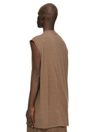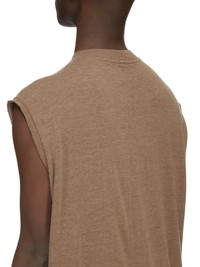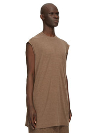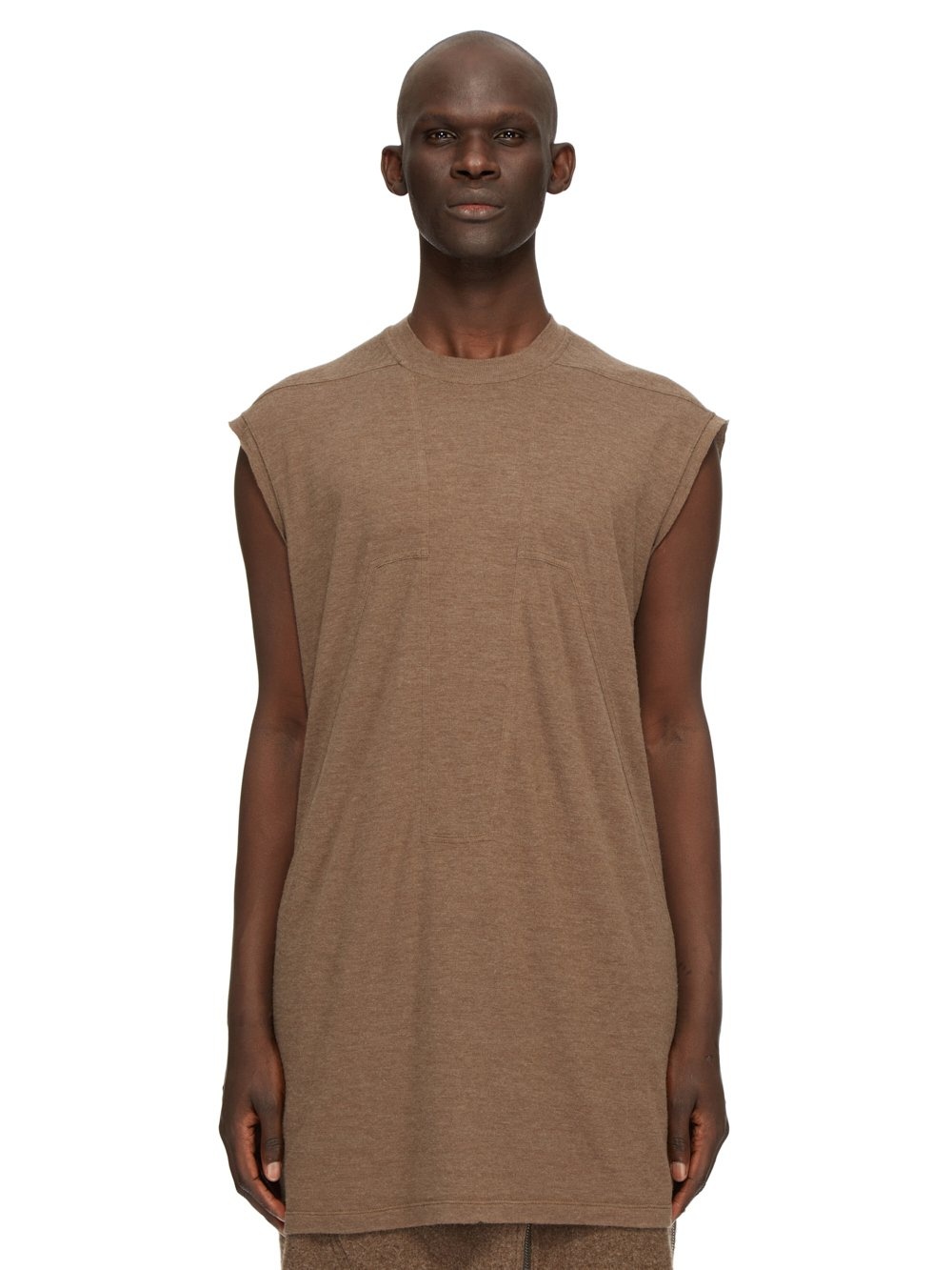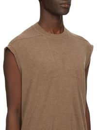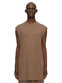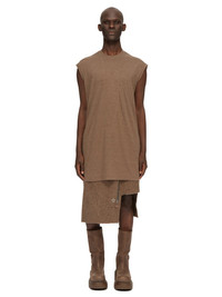 RICK OWENS FW24 PORTERVILLE SPLINTERED TARP T IN FAWN RAININO JERSEY THIS SPLINTERED TARP T IS BELOW HIP-LENGTH WITH A LOOSE FIT. IT IS SLEEVELESS WITH WIDE SHOULDERS AND A RIBBED CREWNECK. IT HAS SIGNATURE FRONT LEVEL SHOULDER SEAMS AND SINGLE SEAM RUNNING DOWN THE CENTRE BACK SPINE. IT FEATURES THE SPLINTERED MOTIVO, WITH SEAM LINES DESCENDING FROM THE NECK TO A BLUNT POINT AT THE WAIST AND ACROSS THE CHEST, AND SLOPING DOWN THE SIDE BODY, WRAPPING TO THE HEM THIS MEDIUMWEIGHT AND FLUID VISCOSE AND WOOL BLEND JERSEY HAS A SOFT, WARM HANDFEEL AND A SLIGHTLY HAIRY SURFACE TEXTURE. WE STRIVE TO KEEP OUR PRODUCTION AS LOCAL AS POSSIBLE. THE FULL MANUFACTURING CYCLE OF THIS PRODUCT, FROM THE MATERIAL KNITTING TO SEWING AND FINISHING, WAS UNDERTAKEN CLOSE TO OUR HOME BASE IN CONCORDIA, ITALY. THIS JERSEY IS MADE FROM FSC® CERTIFIED VISCOSE AND RWS CERTIFIED WOOL. - COLOR: FAWN - MATERIAL: 30% VISCOSE + 30% NYLON + 20% ANGORA + 20% WOOL - MODEL IS 189CM TALL - MODEL WEARS SIZE S