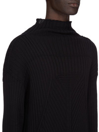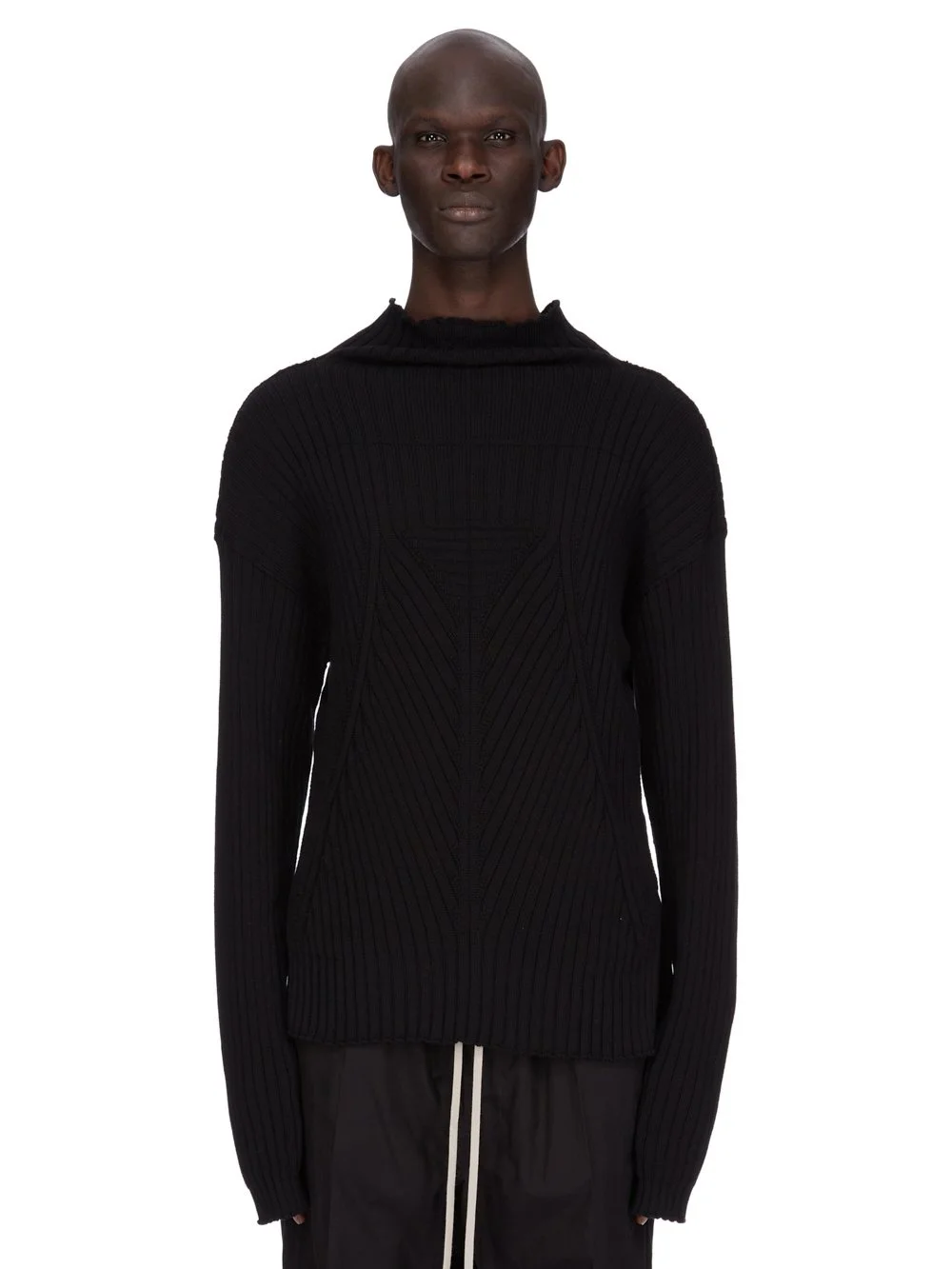 RICK OWENS SS25 HOLLYWOOD TABARD IN BLACK MEGARIB COTTON KNIT THIS TABARD IS BELOW-HIP LENGTH, WITH LONG SLEEVES. IT HAS A HIGH TABARD NECK AND FEATURES A MEGARIB KNIT DESIGN, WITH WIDE RIB LINES RUNNING VERTICALLY DOWN THE ARMS AND CHEST, FINISHING IN A SMALL RIB TRIANGLE, BEFORE DESCENDING INTO DIAGONAL LINES THAT RUN DOWNWARDS INTO THE CENTER FRONT. IT HAS A VERTICAL RIB BACK WITH THE SIGNATURE KNIT CHANNEL RUNNING DOWN THE CENTER BACK SPINE THIS HEAVYWEIGHT COTTON IS KNITTED IN A WIDE RIB WITH A GRAPHIC MOTIF. IT HAS A SOFT HANDFEEL COLOR: BLACK MATERIAL: 100% COTTON MODEL IS 189CM TALL MODEL WEARS SIZE M