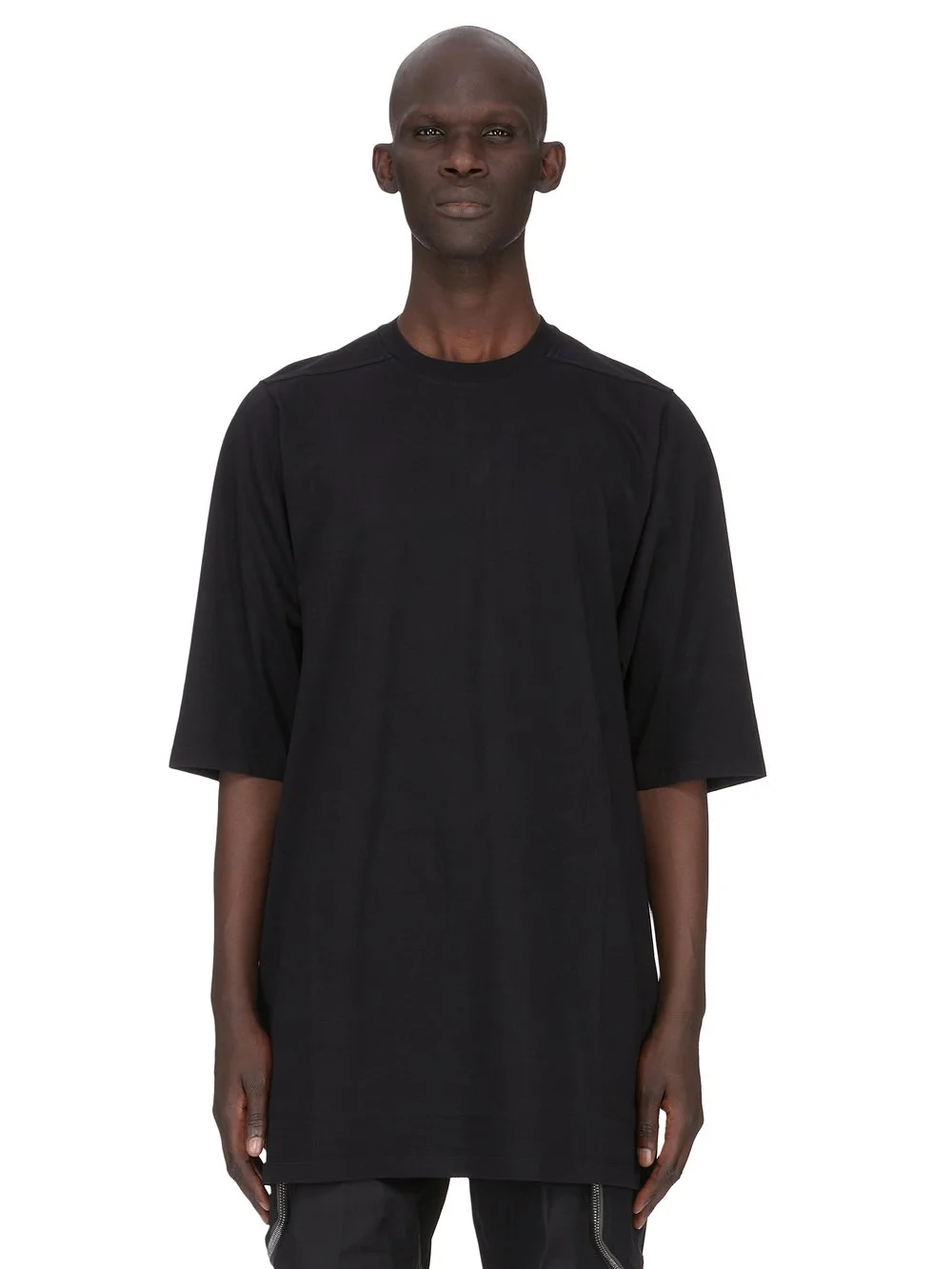 RICK OWENS SS26 TEMPLE JUMBO SS T IN BLACK CLASSIC COTTON JERSEY THIS JUMBO SS T IS BELOW-HIP LENGTH WITH AN OVERSIZED FIT. IT HAS A RIBBED CREWNECK AND ELBOW-LENGTH SHORT SLEEVES. IT FEATURES SIGNATURE FRONT LEVEL SHOULDER SEAMS AND A CENTER BACK SEAM THIS MEDIUMWEIGHT CLASSIC COTTON JERSEY IS COMPACT WITH A DRY HANDFEEL THIS JERSEY IS MADE USING GOTS CERTIFIED ORGANIC COTTON WHICH MEANS THE NATURAL FIBER IS GROWN WITHOUT HARMFUL CHEMICALS, LEAVING OUR SOIL, AIR AND WATER CLEANER FROM CONTAMINATES WE STRIVE TO KEEP OUR PRODUCTION AS LOCAL AS POSSIBLE. THE FULL MANUFATURING CYCLE OF THIS PRODUCT, FROM THE MATERIAL KNITTING TO SEWING AND FINISHING, WAS UNDERTAKEN CLOSE TO OUR HOME BASE IN CONCORDIA, ITALY COLOR: BLACK MATERIAL:100% COTTON MODEL IS 189CM TALL MODEL WEARS SIZE S