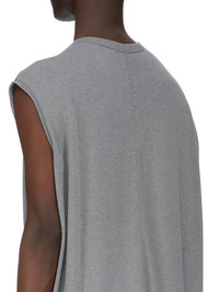RICK OWENS FW25 CONCORDIANS SPLINTERED TARP T IN WASHED INDIGO RAININO JERSEY THIS TARP T IS BELOW HIP LENGTH WITH A LOOSE FIT. IT IS SLEEVELESS WITH WIDE SHOULDERS AND A RIBBED CREW NECK. IT HAS SIGNATURE FRONT LEVEL SHOULDER SEAMS AND SINGLE SEAM RUNNING DOWN THE CENTRE BACK SPINE THIS MEDIUMWEIGHT AND FLUID VISCOSE AND WOOL BLEND JERSEY HAS A SOFT, WARM HANDFEEL AND A SLIGHTLY HAIRY SURFACE TEXTURE WE STRIVE TO KEEP OUR PRODUCTION AS LOCAL AS POSSIBLE. THE FULL MANUFACTURING CYCLE OF THIS PRODUCT, FROM THE MATERIAL KNITTING TO SEWING AND FINISHING, WAS UNDERTAKEN CLOSE TO OUR HOME BASE IN CONCORDIA, ITALY THIS JERSEY IS MADE FROM FSC® CERTIFIED VISCOSE AND RWS CERTIFIED WOOL COLOR: WASHED INDIGO MATERIAL: 30% VISCOSE + 30% NYLON + 20% ANGORA + 20% WOOL MODEL IS 189CM TALL MODEL WEARS SIZE S