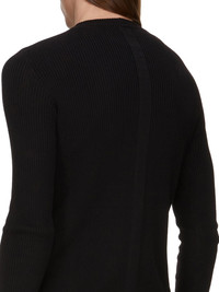 RICK OWENS SS25 HOLLYWOOD RIBBED GEO IN BLACK RIBBED KNIT THIS RIBBED GEO SWEATER IS ABOVE-HIP LENGTH WITH A SLIM FIT AND LONG SLEEVES. IT HAS A RIBBED ROUND NECK, SLEEVES AND BODY, WITH A CONTRAST FLAT SECOND PANEL ACROSS A GEOMETRIC YOKE AND SIGNATURE KNIT LINE RUNNING DOWN THE CENTER BACK SPINE THIS LIGHTWEIGHT AND CLASSIC RIBBED WOOL KNIT HAS A SOFT HANDFEEL. COLOR: BLACK MATERIAL: 100% NEW WOOL MODEL IS 189CM TALL MODEL WEARS SIZE M