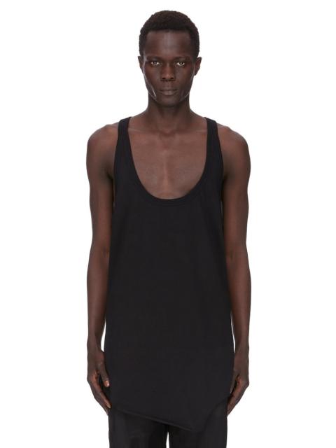 RICK OWENS FW25 CONCORDIANS RUNWAY PONY TANK IN BLACK SHEER WOOL JERSEY THIS PONY TANK IS BELOW HIP LENGTH. IT HAS A LOW SCOOP FRONT, A SLIGHT RACER BACK AND A ROUNDED RAW CUT HEM THAT DIPS IN FRONT AND BACK. THIS LIGHTWEIGHT AND SHEER WOOL BLEND JERSEY HAS A SOFT AND COOL HANDFEEL. THIS JERSEY IS MADE FROM RWS CERTIFIED VIRGIN WOOL AND GRS CERTIFIED RECYCLED POLYESTER COLOR: BLACK MATERIAL: 56% WOOL + 44% POLYESTER MODEL IS 189CM TALL MODEL WEARS SIZE S