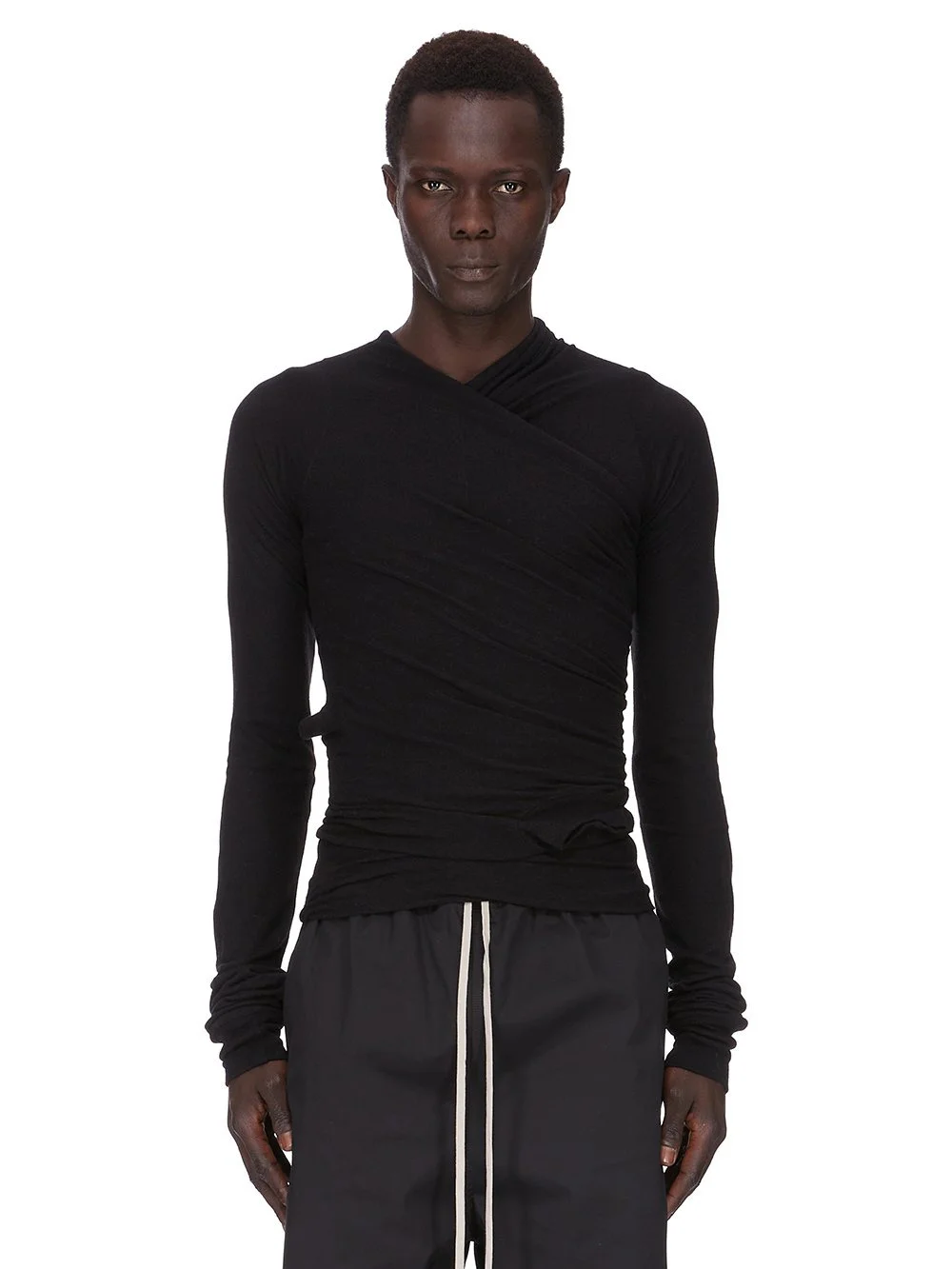 RICK OWENS FW25 CONCORDIANS HOLLYWOOD BANANA LS T IN BLACK RAININO JERSEY THIS HOLLYWOOD BANANA LS T IS ABOVE HIP LENGTH WITH LONG SLEEVES. IT HAS AN UNDER LAYER WITH TWO ROUND HOLES WITH RIB EDGES, AND AN OUTER LAYER THAT FOLDS UP TO CREATE A CRISS CROSS DRAPED NECK FRONT AND BACK THIS MEDIUMWEIGHT AND FLUID VISCOSE AND WOOL BLEND JERSEY HAS A SOFT, WARM HANDFEEL AND A SLIGHTLY HAIRY SURFACE TEXTURE WE STRIVE TO KEEP OUR PRODUCTION AS LOCAL AS POSSIBLE. THE FULL MANUFACTURING CYCLE OF THIS PRODUCT, FROM THE MATERIAL KNITTING TO SEWING AND FINISHING, WAS UNDERTAKEN CLOSE TO OUR HOME BASE IN CONCORDIA, ITALY THIS JERSEY IS MADE FROM FSC® CERTIFIED VISCOSE AND RWS CERTIFIED WOOL COLOR: BLACK MATERIAL: 30% VISCOSE + 30% NYLON + 20% ANGORA + 20% WOOL MODEL IS 189CM TALL MODEL WEARS SIZE S