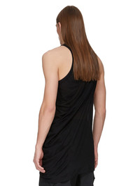 RICK OWENS SS25 HOLLYWOOD ANTHEM TANK IN BLACK UNSTABLE COTTON THIS ANTHEM TANK IS BELOW IS HIP LENGTH. IT IS SLEEVELESS WITH A ROUND NECK, AND DEEP ARMHOLES. IT FEATURES DRAPING WHICH STARTS AT THE RIGHT ARM, DRAPING AROUND THE BODY TO THE RIGHT BACK SIDE, AND FALLS IN FOLDS ON THE LEFT HIP. IT HAS LEVEL SHOULDER SEAMS AND SIGNATURE SEAM RUNNING DOWN THE CENTER BACK SPINE THIS LIGHTWEIGHT COTTON JERSEY IS SEMI-TRANSPARENT WITH A SOFT HANDFEEL. THIS JERSEY IS MADE USING GOTS CERTIFIED ORGANIC COTTON WHICH MEANS THE NATURAL FIBER IS GROWN WITHOUT HARMFUL CHEMICALS, LEAVING OUR SOIL, AIR AND WATER CLEANER FROM CONTAMINATES WE STRIVE TO KEEP OUR PRODUCTION AS LOCAL AS POSSIBLE. THE FULL MANUFACTURING CYCLE OF THIS PRODUCT, FROM THE MATERIAL KNITTING TO SEWING AND FINISHING, WAS UNDERTAKEN CLOSE TO OUR HOME BASE IN CONCORDIA, ITALY COLOR: BLACK MATERIAL: 100% COTTON MODEL IS 189CM TALL MODEL WEARS SIZE S