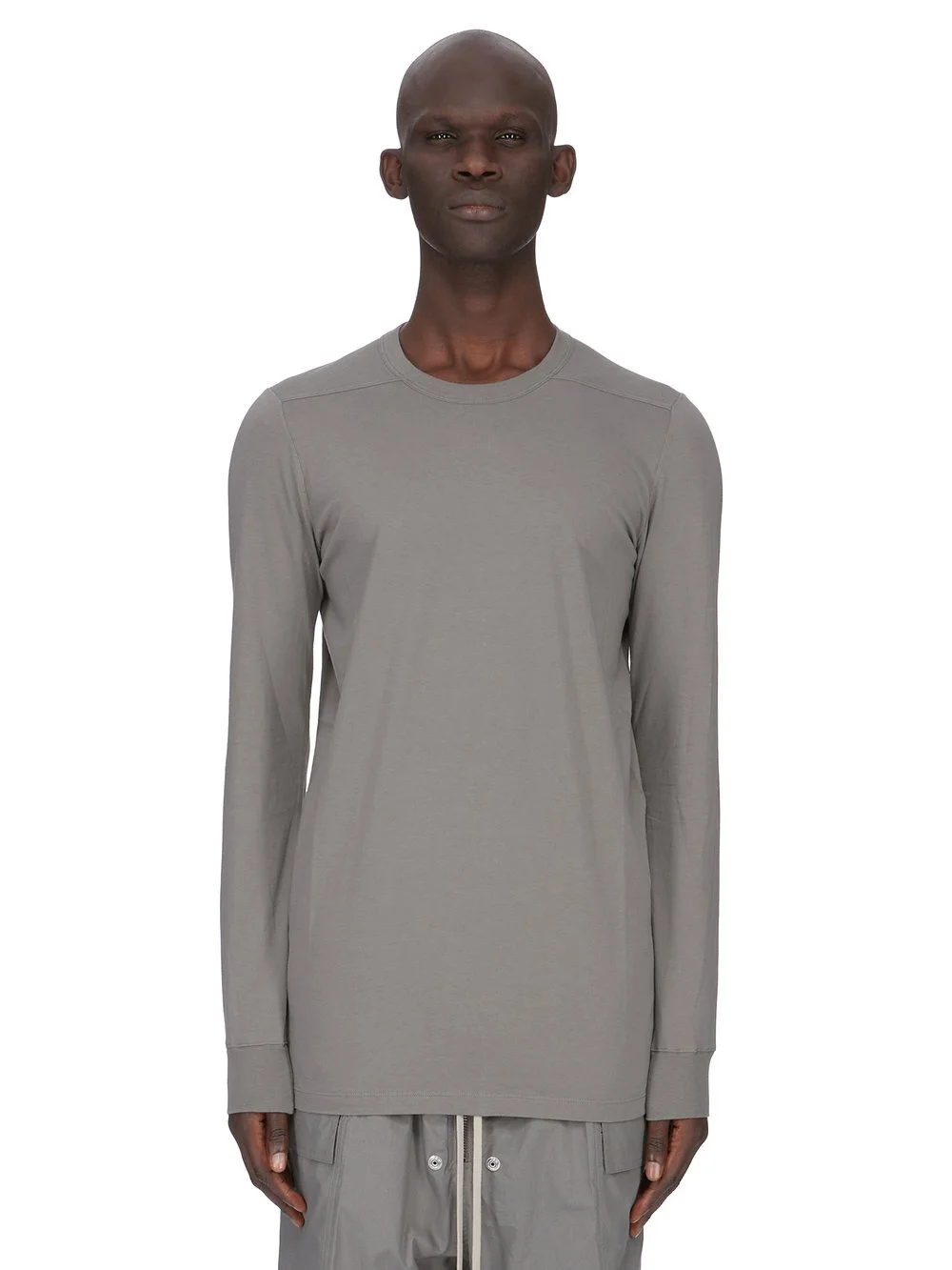 RICK OWENS SS26 TEMPLE LEVEL LS T IN EUCA CLASSIC COTTON JERSEY THIS LEVEL LS T IS BELOW-HIP LENGTH WITH LONG SLEEVES. IT HAS A RIBBED ROUND NECK AND CUFFS. IT FEATURES THE SIGNATURE LEVEL SHOULDER SEAMS AND SINGLE SEAM RUNNING DOWN THE CENTER BACK SPINE. THIS MEDIUMWEIGHT CLASSIC COTTON JERSEY IS COMPACT WITH A DRY HANDFEEL. THIS JERSEY IS MADE USING GOTS CERTIFIED ORGANIC COTTON WHICH MEANS THE NATURAL FIBER IS GROWN WITHOUT HARMFUL CHEMICALS, LEAVING OUR SOIL, AIR AND WATER CLEANER FROM CONTAMINATES. WE STRIVE TO KEEP OUR PRODUCTION AS LOCAL AS POSSIBLE. THE FULL MANUFATURING CYCLE OF THIS PRODUCT, FROM THE MATERIAL KNITTING TO SEWING AND FINISHING, WAS UNDERTAKEN CLOSE TO OUR HOME BASE IN CONCORDIA, ITALY. COLOR: EUCA MATERIAL:100% COTTON MODEL IS 189CM TALL MODEL WEARS SIZE S