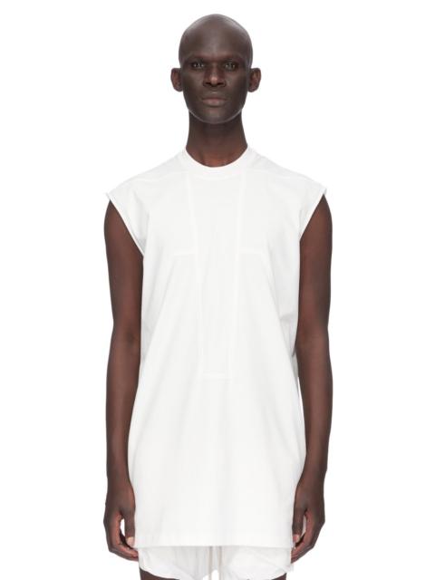 RICK OWENS SS24 LIDO SPLINTERED TARP T IN BLACK HEAVY JERSEY THIS SPLINTERED TARP T IS BELOW HIP LENGTH WITH A LOOSE FIT. IT IS SLEEVELESS WITH WIDE SHOULDERS AND A RIBBED CREW NECK. IT HAS SIGNATURE FRONT LEVEL SHOULDER SEAMS AND SINGLE SEAM RUNNING DOWN THE CENTRE BACK SPINE. IT FEATURES THE SPLINTERED MOTIVO, WITH SEAM LINES DESCENDING FROM THE NECK TO A BLUNT POINT AT THE WAIST AND ACROSS THE CHEST THEN SLOPING DOWN THE SIDE BODY AND WRAPPING TO THE HEM THIS HEAVYWEIGHT JERSEY IS COMPACT WITH A DRY HANDFEEL. THIS JERSEY IS MADE USING GOTS CERTIFIED ORGANIC COTTON WHICH MEANS THE NATURAL FIBER IS GROWN WITHOUT HARMFUL CHEMICALS, LEAVING OUR SOIL, AIR AND WATER CLEANER FROM CONTAMINATES - COLOR: BLACK - MATERIAL: 100% COTTON - MODEL IS 189CM TALL - MODEL WEARS SIZE S