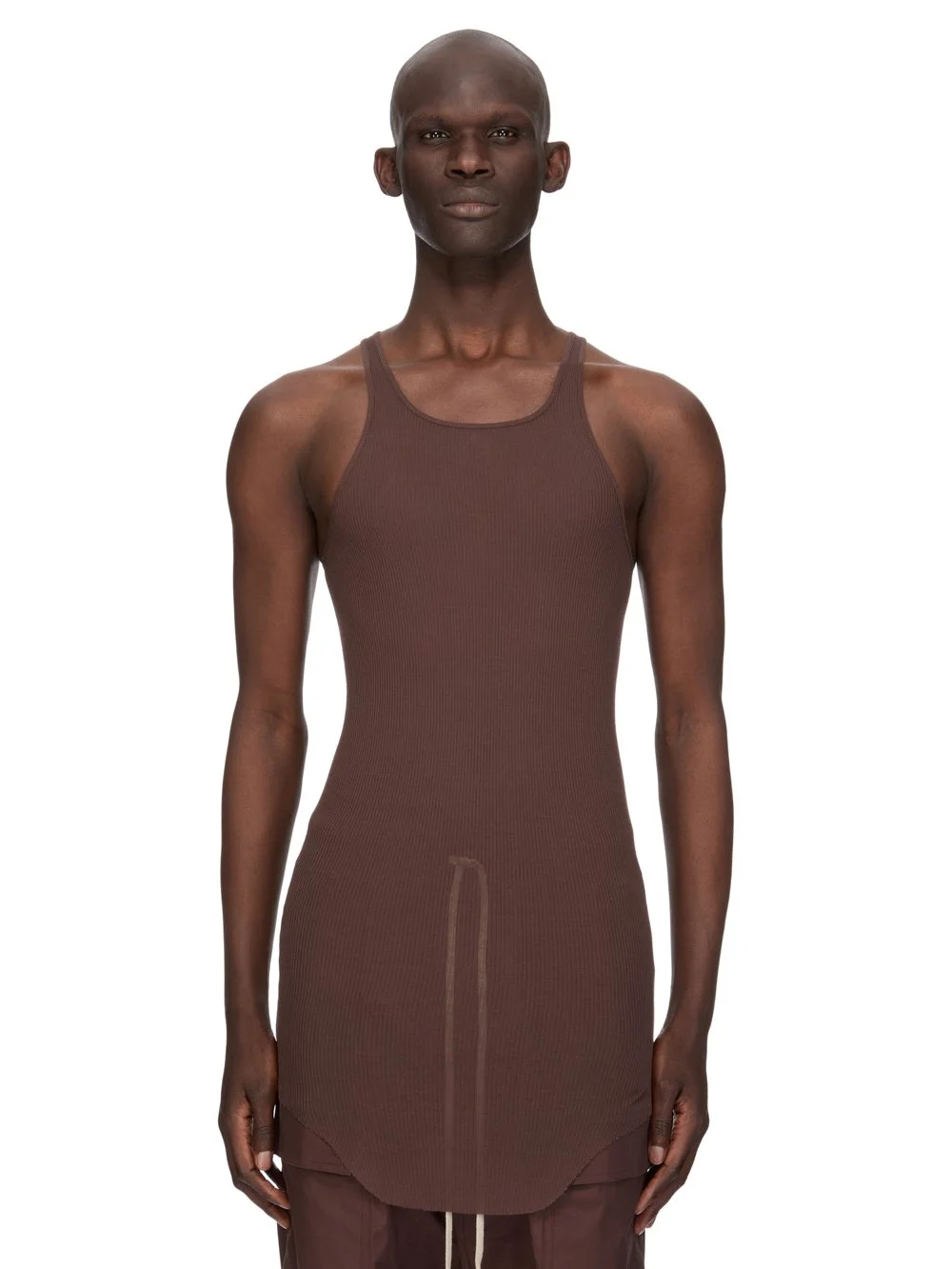 RICK OWENS SS26 TEMPLE BASIC RIB TANK IN MACASSAR VISCOSE SILK RIB JERSEY THIS BASIC RIB TANK IS HIP LENGTH WITH A ROUNDED, RAW CUT, HEM THAT DIPS IN FRONT AND BACK. IT HAS A ROUND NECKLINE AND THIN SHOULDER STRAPS THAT FLOW INTO A SLIGHT RACER BACK. IT FEATURES THE SIGNATURE SINGLE SEAM RUNNING DOWN THE CENTER BACK SPINE THIS LIGHTWEIGHT VISCOSE AND SILK RIB JERSEY HAS A DISTINCT RIB PATTERN AND SOFT HANDFEEL THIS JERSEY IS MADE FROM FSC® (FSC – C162846) CERTIFIED VISCOSE WHICH ENSURES THAT THE FIBERS ARE PRODUCED FROM RESPONSIBLY MANAGED SOURCES AND NO DEFORESTATION OCCURS WE STRIVE TO KEEP OUR PRODUCTION AS LOCAL AS POSSIBLE. THE FULL MANUFACTURING CYCLE OF THIS PRODUCT, FROM THE MATERIAL KNITTING TO SEWING AND FINISHING, WAS UNDERTAKEN CLOSE TO OUR HOME BASE IN CONCORDIA, ITALY COLOR: MACASSAR MATERIAL:88% VISCOSE + 12% SILK MODEL IS 189CM TALL MODEL WEARS SIZE S
