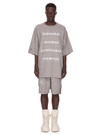 CHAMPION X RICK OWENS SS25 TOMMY T IN GREY MELANGE MELANGE FELPA JERSEY IT FEATURES A 3D EMBROIDERED SIGNATURE CHAMPION X RICK OWENS SUBHUMAN, INHUMAN, SUPERHUMAN, CHAMPION LOGO ON FRONT AND CHAMPION LOGO ON RIGHT SLEEVE. THIS HEAVYWEIGHT FELPA JERSEY IS KNITTED WITH A MULTICOLOURED SLUB YARN THAT CREATES THE VINTAGE MELANGE EFFECT. IT HAS A SOFT HANDFEEL. THIS JERSEY IS MADE USING CERTIFIED ORGANIC COTTON WHICH MEANS THE NATURAL FIBER IS GROWN WITHOUT HARMFUL CHEMICALS, LEAVING OUR SOIL, AIR AND WATER CLEANER FROM CONTAMINATES. COLOR: GREY MELANGE MATERIAL: 100% COTTON MODEL WEARS SIZE M MODEL IS 189CM TALL