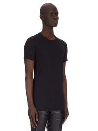 RICK OWENS SS24 LIDO BASIC SS T IN BLACK CLASSIC COTTON JERSEY THIS BASIC SS T IS BELOW HIP LENGTH WITH SHORT SLEEVES. IT HAS A RIBBED ROUND NECK AND RAW CUT HEM AND SLEEVES. IT FEATURES THE SIGNATURE SINGLE SEAM RUNNING DOWN THE CENTRE BACK SPINE THIS MEDIUMWEIGHT CLASSIC COTTON JERSEY IS COMPACT WITH A DRY HANDFEEL. THIS JERSEY IS MADE USING GOTS CERTIFIED ORGANIC COTTON WHICH MEANS THE NATURAL FIBER IS GROWN WITHOUT HARMFUL CHEMICALS, LEAVING OUR SOIL, AIR AND WATER CLEANER FROM CONTAMINATES WE STRIVE TO KEEP OUR PRODUCTION AS LOCAL AS POSSIBLE. THE FULL MANUFACTURING CYCLE OF THIS PRODUCT, FROM THE MATERIAL KNITTING TO SEWING AND FINISHING, WAS UNDERTAKEN CLOSE TO OUR HOME BASE IN CONCORDIA, ITALY. - COLOR: BLACK - MATERIAL: 100% COTTON - MODEL IS 189CM TALL - MODEL WEARS SIZE S