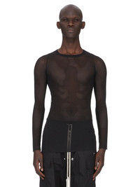 RICK OWENS SS26 TEMPLE RIB LS T IN BLACK STRETCH TULLE THIS RIB LS T IS BELOW-HIP LENGTH WITH A SLIM FIT AND LONG SLEEVES. IT HAS A RIBBED ROUND NECK, RAW CUT HEM AND CUFFS, AND FEATURES THE SIGNATURE SINGLE SEAM RUNNING DOWN CENTER BACK SPINE THIS LIGHTWEIGHT AND SHEER NYLON STRETCH TULLE HAS A SOFT HANDFELL THIS FABRIC IS MADE USING GRS CERTIFIED RECYCLED POLYAMIDE WHICH ENSURES A REDUCTION IN WATER CONSUMPTION, EMISSIONS AND HAZARDOUS WASTE, LESSENING THE DEPENDENCE ON NON-RENEWABLE RESOURCES COLOR: BLACK MATERIAL: 93% NYLON + 7% ELASTANE MODEL IS 189CM TALL MODEL WEARS SIZE S