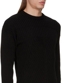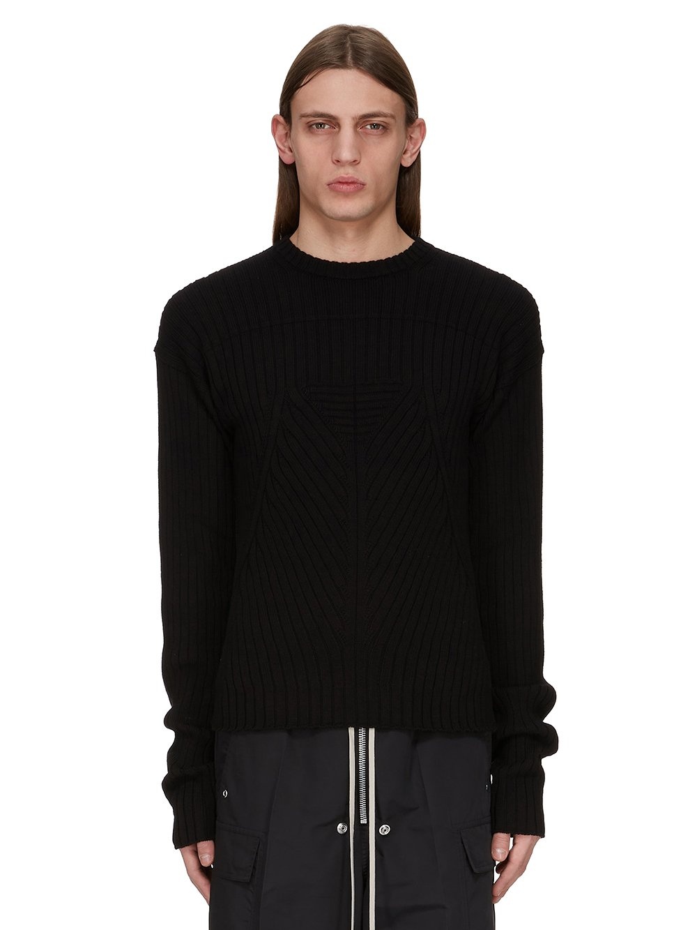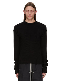 RICK OWENS SS25 HOLLYWOOD ROUND NECK IN BLACK MEGARIB COTTON KNIT THIS ROUND NECK IS HIP LENGTH WITH LONG SLEEVES. IT HAS A RIBBED ROUND NECK AND FEATURES A MEGARIB KNIT DESIGN WITH WIDE RIB LINES RUNNING VERTICALLY DOWN THE ARMS AND CHEST, FINISHING IN A SMALL RIB TRIANGLE, BEFORE DESCENDING INTO DIAGONAL LINES THAT RUN DOWNWARDS INTO THE CENTER FRONT. IT HAS A VERTICAL RIB BACK WITH THE SIGNATURE KNIT CHANNEL RUNNING DOWN THE CENTER BACK SPINE THIS HEAVYWEIGHT COTTON IS KNITTED IN A WIDE RIB WITH A GRAPHIC MOTIF. IT HAS A SOFT HANDFEEL COLOR: BLACK MATERIAL: 100% COTTON MODEL IS 189CM TALL MODEL WEARS SIZE M
