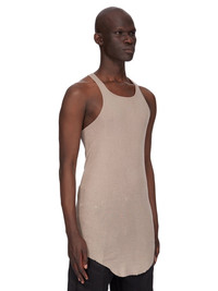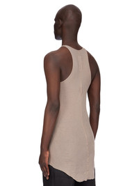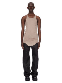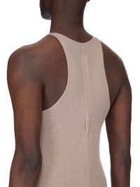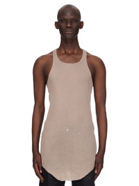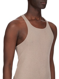 RICK OWENS SS25 HOLLYWOOD BASIC RIB TANK IN FLESH MINI RIB JERSEY THIS BASIC RIB TANK IS HIP LENGTH WITH A ROUNDED, RAW CUT, HEM THAT DIPS IN FRONT AND BACK. IT HAS A ROUND NECKLINE AND THIN SHOULDER STRAPS THAT FLOW INTO A SLIGHT RACER BACK. IT FEATURES THE SIGNATURE SINGLE SEAM RUNNING DOWN THE CENTER BACK SPINE THIS LIGHTWEIGHT MINI RIB JERSEY HAS A TEXTURED SURFACE AND SOFT HANDFEEL. THIS JERSEY IS MADE USING GOTS CERTIFIED ORGANIC COTTON WHICH MEANS THE NATURAL FIBER IS GROWN WITHOUT HARMFUL CHEMICALS, LEAVING OUR SOIL, AIR AND WATER CLEANER FROM CONTAMINATES WE STRIVE TO KEEP OUR PRODUCTION AS LOCAL AS POSSIBLE. THE FULL MANUFACTURING CYCLE OF THIS PRODUCT, FROM THE MATERIAL KNITTING TO SEWING AND FINISHING, WAS UNDERTAKEN CLOSE TO OUR HOME BASE IN CONCORDIA, ITALY. COLOR: FLESH MATERIAL: 100% COTTON MODEL IS 189CM TALL MODEL WEARS SIZE S