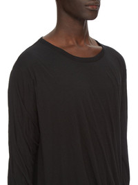RICK OWENS FW24 PORTERVILLE DOUBLE LS T IN BLACK UNSTABLE COTTON THIS DOUBLE LS T IS BELOW HIP-LENGTH AND HAS LONG SLEEVES AND A RIBBED ROUND NECK AND CUFFS. IT FEATURES A DOUBLE LAYER OF FABRIC, WITH THE HEM ON THE FOLD, CREATING A DRAPED EFFECT, AND THE SIGNATURE SINGLE SEAM RUNNING DOWN THE CENTRE BACK SPINE THIS LIGHTWEIGHT COTTON JERSEY IS SEMI-TRANSPARENT WITH A SOFT HANDFEEL. THIS JERSEY IS MADE USING GOTS CERTIFIED ORGANIC COTTON WHICH MEANS THE NATURAL FIBER IS GROWN WITHOUT HARMFUL CHEMICALS, LEAVING OUR SOIL, AIR AND WATER CLEANER FROM CONTAMINATES WE STRIVE TO KEEP OUR PRODUCTION AS LOCAL AS POSSIBLE. THE FULL MANUFACTURING CYCLE OF THIS PRODUCT, FROM THE MATERIAL KNITTING TO SEWING AND FINISHING, WAS UNDERTAKEN CLOSE TO OUR HOME BASE IN CONCORDIA, ITALY. - COLOR: BLACK - MATERIAL: 100% COTTON - MODEL IS 189CM TALL - MODEL WEARS SIZE S