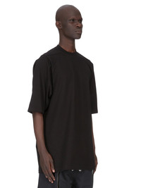 RICK OWENS SS26 TEMPLE JUMBO SS T IN BLACK HEAVY JERSEY THIS JUMBO SS T IS BELOW-HIP LENGTH WITH AN OVERSIZED FIT. IT HAS A RIBBED CREWNECK AND ELBOW-LENGTH SHORT SLEEVES. IT FEATURES SIGNATURE FRONT LEVEL SHOULDER SEAMS AND A CENTER BACK SEAM THIS HEAVYWEIGHT JERSEY IS COMPACT WITH A DRY HANDFEEL THIS JERSEY IS MADE USING GOTS CERTIFIED ORGANIC COTTON WHICH MEANS THE NATURAL FIBER IS GROWN WITHOUT HARMFUL CHEMICALS, LEAVING OUR SOIL, AIR AND WATER CLEANER FROM CONTAMINATES COLOR: BLACK MATERIAL:100% COTTON MODEL IS 189CM TALL MODEL WEARS SIZE S