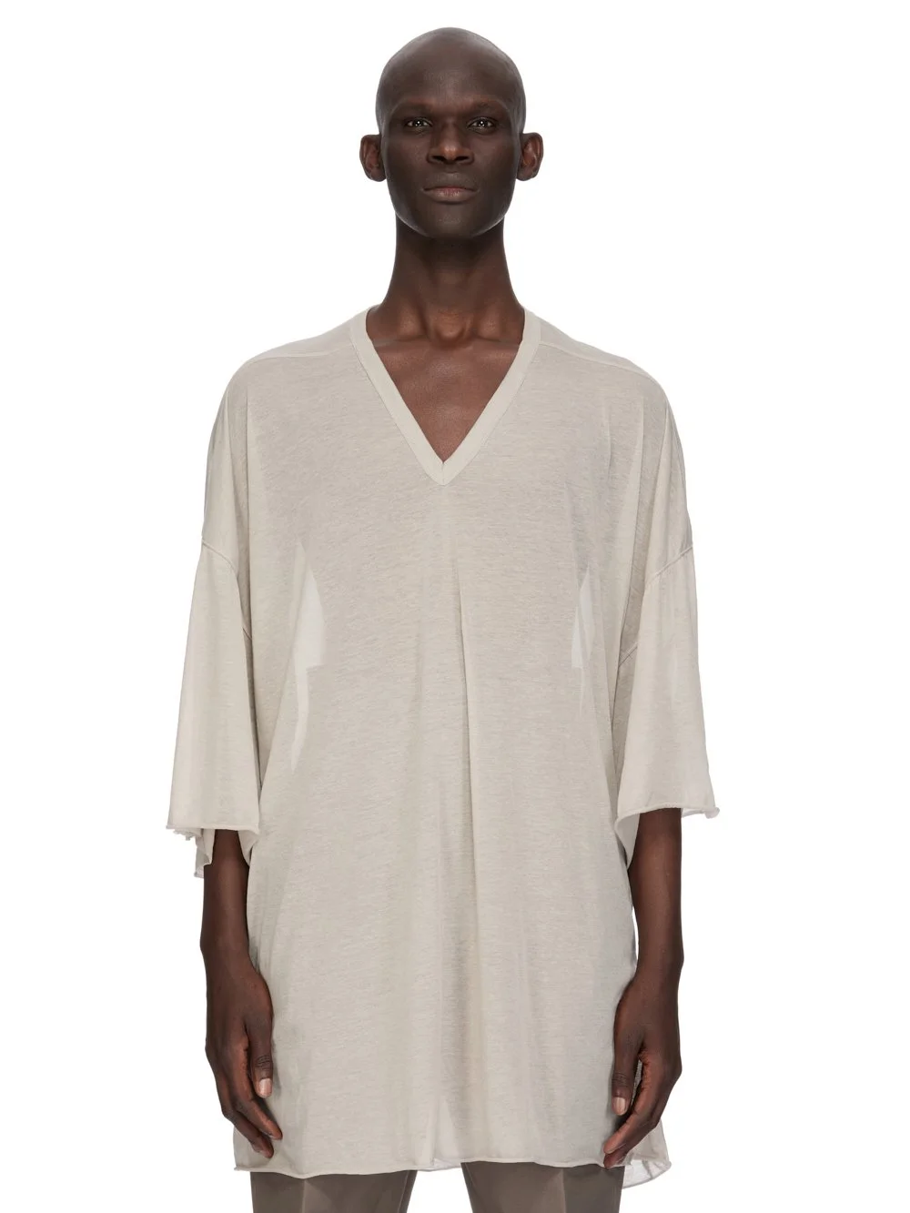 RICK OWENS SS26 TEMPLE V TOMMY T IN PEARL UNSTABLE COTTON THIS V TOMMY T IS BELOW-HIP LENGTH WITH A JUMBO OVERSIZED FIT. IT HAS WIDE SHORT SLEEVES WITH A DROPPED ARMHOLE, RAW CUT HEMS AND A V NECK. IT FEATURES SIGNATURE FRONT LEVEL SHOULDER SEAMS THIS LIGHTWEIGHT COTTON JERSEY IS SEMI-TRANSPARENT WITH A SOFT HANDFEEL THIS JERSEY IS MADE USING GOTS CERTIFIED ORGANIC COTTON WHICH MEANS THE NATURAL FIBER IS GROWN WITHOUT HARMFUL CHEMICALS, LEAVING OUR SOIL, AIR AND WATER CLEANER FROM CONTAMINATES WE STRIVE TO KEEP OUR PRODUCTION AS LOCAL AS POSSIBLE. THE FULL MANUFATURING CYCLE OF THIS PRODUCT, FROM THE MATERIAL KNITTING TO SEWING AND FINISHING, WAS UNDERTAKEN CLOSE TO OUR HOME BASE IN CONCORDIA, ITALY COLOR: PEARL MATERIAL:100% COTTON MODEL IS 189CM TALL ITEM IS AVAILABLE IN ONE SIZE