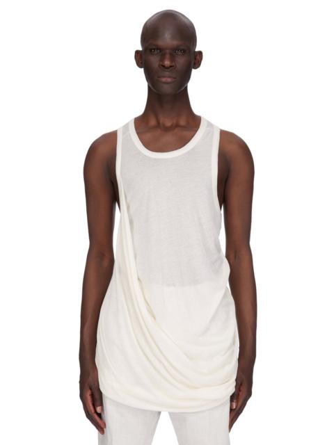 RICK OWENS SS25 HOLLYWOOD ANTHEM TANK IN NATURAL UNSTABLE COTTON THIS ANTHEM TANK IS BELOW IS HIP LENGTH. IT IS SLEEVELESS WITH A ROUND NECK, AND DEEP ARMHOLES. IT FEATURES DRAPING WHICH STARTS AT THE RIGHT ARM, DRAPING AROUND THE BODY TO THE RIGHT BACK SIDE, AND FALLS IN FOLDS ON THE LEFT HIP. IT HAS LEVEL SHOULDER SEAMS AND SIGNATURE SEAM RUNNING DOWN THE CENTER BACK SPINE THIS LIGHTWEIGHT COTTON JERSEY IS SEMI-TRANSPARENT WITH A SOFT HANDFEEL. THIS JERSEY IS MADE USING GOTS CERTIFIED ORGANIC COTTON WHICH MEANS THE NATURAL FIBER IS GROWN WITHOUT HARMFUL CHEMICALS, LEAVING OUR SOIL, AIR AND WATER CLEANER FROM CONTAMINATES WE STRIVE TO KEEP OUR PRODUCTION AS LOCAL AS POSSIBLE. THE FULL MANUFACTURING CYCLE OF THIS PRODUCT, FROM THE MATERIAL KNITTING TO SEWING AND FINISHING, WAS UNDERTAKEN CLOSE TO OUR HOME BASE IN CONCORDIA, ITALY COLOR: NATURAL MATERIAL: 100% COTTON MODEL IS 189CM TALL MODEL WEARS SIZE S