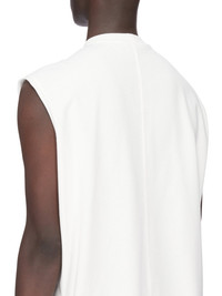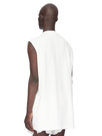 RICK OWENS SS24 LIDO SPLINTERED TARP T IN MILK HEAVY JERSEY THIS SPLINTERED TARP T IS BELOW HIP LENGTH WITH A LOOSE FIT. IT IS SLEEVELESS WITH WIDE SHOULDERS AND A RIBBED CREW NECK. IT HAS SIGNATURE FRONT LEVEL SHOULDER SEAMS AND SINGLE SEAM RUNNING DOWN THE CENTRE BACK SPINE. IT FEATURES THE SPLINTERED MOTIVO, WITH SEAM LINES DESCENDING FROM THE NECK TO A BLUNT POINT AT THE WAIST AND ACROSS THE CHEST THEN SLOPING DOWN THE SIDE BODY AND WRAPPING TO THE HEM THIS HEAVYWEIGHT JERSEY IS COMPACT WITH A DRY HANDFEEL. THIS JERSEY IS MADE USING GOTS CERTIFIED ORGANIC COTTON WHICH MEANS THE NATURAL FIBER IS GROWN WITHOUT HARMFUL CHEMICALS, LEAVING OUR SOIL, AIR AND WATER CLEANER FROM CONTAMINATES - COLOR: MILK - MATERIAL: 100% COTTON - MODEL IS 189CM TALL - MODEL WEARS SIZE S