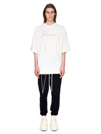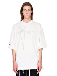 CHAMPION X RICK OWENS TOMMY T IN MILK WHITE MEDIUM WEIGHT COTTON JERSEY THIS TOMMY T IS BELOW HIP LENGTH WITH A JUMBO OVERSIZED FIT. IT HAS WIDE SHORT SLEEVES WITH A DROPPED ARMHOLE, AND A RIBBED CREWNECK. IT FEATURES SIGNATURE FRONT LEVEL SHOULDER SEAMS AND A CENTRE BACK SEAM IT HAS A 3D EMBROIDERED SIGNATURE RICK OWENS X CHAMPION PENTAGRAM LOGO ON FRONT AND CHAMPION LOGO ON RIGHT SLEEVE A MEDIUMWEIGHT COTTON JERSEY WITH A DRY HANDFEEL MADE FROM GOTS CERTIFIED ORGANIC COTTON. WE CHOSE TO MAKE THIS GARMENT USING CERTIFIED ORGANIC COTTON BECAUSE IT MEANS THE NATURAL FIBER IS GROWN WITHOUT HARMFUL CHEMICALS, WHICH LEAVES OUR SOIL, AIR AND WATER CLEANER FROM CONTAMINATES - COLOR: MILK WHITE - MATERIAL: 100% COTTON - MODEL IS WEARING SIZE S - MODEL IS 189 CM TALL