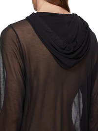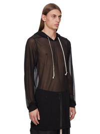 RICK OWENS SS25 HOLLYWOOD RUNWAY HOODIE IN BLACK VISCOSE CREPE JERSEY THIS HOODIE IS BELOW-HIP LENGTH WITH LONG SLEEVES. IT FEATURES A DRAWSTRING HOOD AND RIB CUFFS. IT HAS SIGNATURE LEVEL SEAMS ON THE SHOULDERS THIS LIGHTWEIGHT AND FLUID JERSEY IS SEMI TRANSPARENT WITH A DRY CREPE HANDFEEL. THIS JERSEY IS MADE FROM FSC® CERTIFIED VISCOSE WHICH ENSURES THAT THE FIBERS ARE PRODUCED FROM RESPONSIBLY MANAGED SOURCES AND NO DEFORESTATION OCCURS COLOR: BLACK MATERIAL: 100% VISCOSE MODEL IS 189CM TALL MODEL WEARS SIZE S