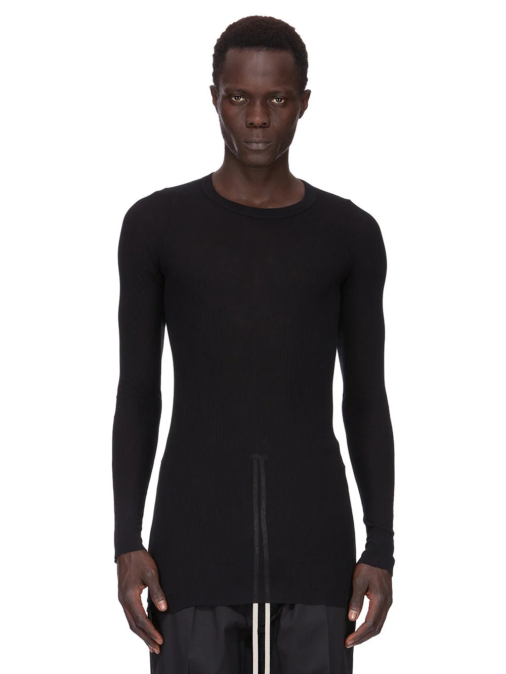 RICK OWENS FOREVER RIB LS T IN BLACK VISCOSE SILK RIB JERSEY THIS RIB LS T IS BELOW HIP LENGTH WITH A SLIM FIT AND LONG SLEEVES. IT HAS A RIBBED ROUND NECK, RAW CUT HEM AND CUFFS, AND FEATURES THE SIGNATURE SINGLE SEAM RUNNING DOWN CENTRE BACK SPINE THIS LIGHTWEIGHT VISCOSE AND SILK RIB JERSEY HAS A DISTINCT RIB PATTERN AND SOFT HANDFEEL. THIS JERSEY IS MADE FROM FSC® CERTIFIED VISCOSE WHICH ENSURES THAT THE FIBERS ARE PRODUCED FROM RESPONSIBLY MANAGED SOURCES AND NO DEFORESTATION OCCURS WE STRIVE TO KEEP OUR PRODUCTION AS LOCAL AS POSSIBLE. THE FULL MANUFACTURING CYCLE OF THIS PRODUCT, FROM THE MATERIAL KNITTING TO SEWING AND FINISHING, WAS UNDERTAKEN CLOSE TO OUR HOME BASE IN CONCORDIA, ITALY. - COLOR:BLACK - MATERIAL: 88% VISCOSE + 12% SILK - MODEL IS WEARING SIZE S - MODEL IS 189 CM TALL