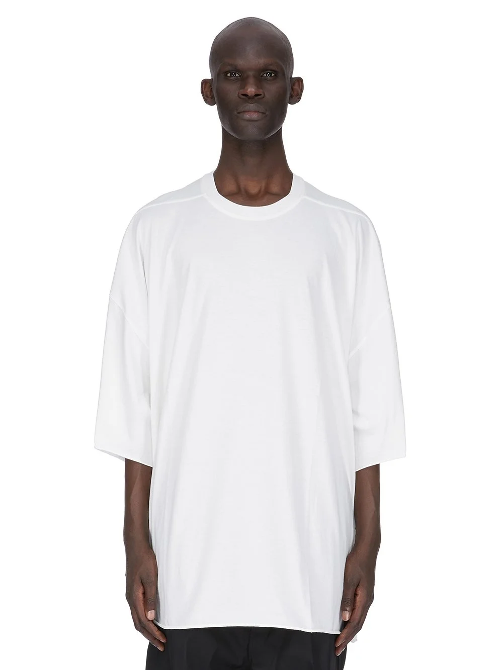 RICK OWENS SS25 HOLLYWOOD TOMMY T IN MILK CLASSIC COTTON JERSEY THIS TOMMY T IS BELOW-HIP LENGTH WITH A JUMBO OVERSIZED FIT. IT HAS WIDE, SHORT SLEEVES WITH A DROPPED ARMHOLE AND A RIBBED CREWNECK. IT FEATURES SIGNATURE FRONT LEVEL SHOULDER SEAMS THIS MEDIUMWEIGHT CLASSIC COTTON JERSEY IS COMPACT WITH A DRY HANDFEEL. THIS JERSEY IS MADE USING GOTS CERTIFIED ORGANIC COTTON WHICH MEANS THE NATURAL FIBER IS GROWN WITHOUT HARMFUL CHEMICALS, LEAVING OUR SOIL, AIR AND WATER CLEANER FROM CONTAMINATES WE STRIVE TO KEEP OUR PRODUCTION AS LOCAL AS POSSIBLE. THE FULL MANUFACTURING CYCLE OF THIS PRODUCT, FROM THE MATERIAL KNITTING TO SEWING AND FINISHING, WAS UNDERTAKEN CLOSE TO OUR HOME BASE IN CONCORDIA, ITALY. COLOR: MILK MATERIAL: 100% COTTON MODEL IS 189CM TALL ITEM IS AVAILABLE IN ONE SIZE