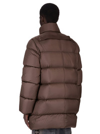 RICK OWENS FW25 CONCORDIANS TURTLE COAT IN DRKDUST LIGHT NYLON THIS TURTLE COAT IS MID-THIGH LENGTH WITH A CENTRE FRONT ZIPPER AND HIGH TUBE-NECK COLLAR WITH BIAS ZIPPER AND SNAPS. IT IS PADDED AND QUILTED WITH HORIZONTAL STITCHING LINES AND HAS SIDE FRONT WELT POCKETS WITH SNAPS. IT FEATURES A SIGNATURE COTTON WEBBING STRAP, WITH RIVET DETAIL, ACROSS THE BACK YOKE. IT HAS TWO INSIDE ZIPPERED POCKETS THIS AIRY AND LIGHTWEIGHT NYLON IS MADE USING GRS CERTIFIED RECYCLED NYLON WHICH ENSURES A REDUCTION IN WATER CONSUMPTION, EMISSIONS AND HAZARDOUS WASTE, LESSENING THE DEPENDENCE ON NON-RENEWABLE RESOURCES COLOR: DRKDUST MATERIAL: 100% NYLON KNIT RIB CUFF 100% NEW WOOL INSIDE POCKETS 97% COTTON + 3% ELASTANE PADDING 90% GOOSE DOWN + 10% MALLARD FEATHERS MODEL IS 189CM TALL MODEL WEARS SIZE 48
