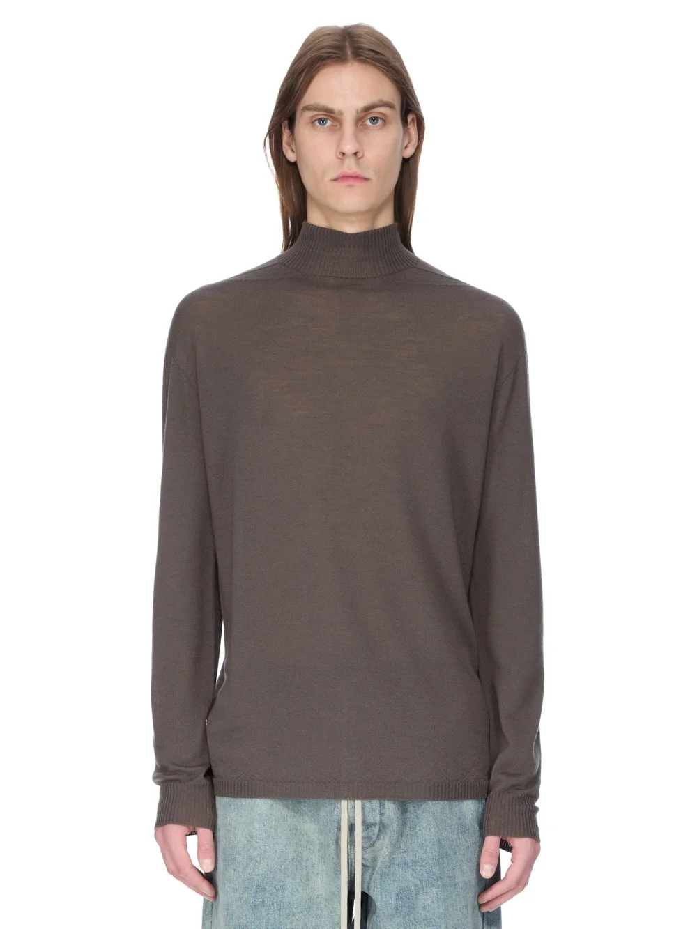 RICK OWENS FW25 CONCORDIANS OVERSIZED TURTLE IN DARK DUST RIBBED KNIT THIS OVERSIZED TURTLE NECK SWEATER IS BELOW HIP LENGTH AND A LOOSE FIT. IT HAS A RIBBED TURTLENECK, HEM AND CUFFS. IT FEATURES SIGNATURE LEVEL SHOULDER SEAMS AND A KNIT LINE RUNNING DOWN THE CENTRE BACK SPINE THIS LIGHTWEIGHT AND CLASSIC RIBBED WOOL KNIT HAS A SOFT HANDFEEL COLOR: DARK DUST MATERIAL: 100% NEW WOOL MODEL IS 189CM TALL MODEL WEARS SIZE M