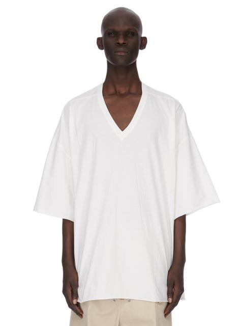 RICK OWENS SS26 TEMPLE V TOMMY T IN SAND CLASSIC COTTON JERSEY THIS V TOMMY T IS BELOW-HIP LENGTH WITH A JUMBO OVERSIZED FIT. IT HAS WIDE SHORT SLEEVES WITH A DROPPED ARMHOLE, RAW CUT HEMS AND A V NECK. IT FEATURES SIGNATURE FRONT LEVEL SHOULDER SEAMS. THIS MEDIUMWEIGHT CLASSIC COTTON JERSEY IS COMPACT WITH A DRY HANDFEEL. THIS JERSEY IS MADE USING GOTS CERTIFIED ORGANIC COTTON WHICH MEANS THE NATURAL FIBER IS GROWN WITHOUT HARMFUL CHEMICALS, LEAVING OUR SOIL, AIR AND WATER CLEANER FROM CONTAMINATES. WE STRIVE TO KEEP OUR PRODUCTION AS LOCAL AS POSSIBLE. THE FULL MANUFATURING CYCLE OF THIS PRODUCT, FROM THE MATERIAL KNITTING TO SEWING AND FINISHING, WAS UNDERTAKEN CLOSE TO OUR HOME BASE IN CONCORDIA, ITALY. COLOR: SAND MATERIAL:100% COTTON MODEL IS 189CM TALL ITEM IS AVAILABLE IN ONE SIZE