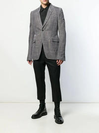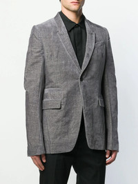 velvet blazer Rick Owens is renowned for his avant-garde aesthetic that pushes the boundaries of traditional shapes. This grey cotton blend velvet blazer from Rick Owens features a shawl lapel, a concealed front pocket, a button fastening, long sleeves and two front pockets. Made in Italy Composition Outer: Cotton 60%, Linen/Flax 40% Lining: Cotton 100%, Viscose 53%, Cupro 47% SIZE & FIT Model measurements Height 6 ft 2 in(1.87 m) Bust/Chest 37.79 in(96 cm) Hips 37.79 in(96 cm) Waist 30.31 in(77 cm) FittingInformation This piece fits true to size. We recommend you get your regular size Cut for a slim fit Made with a mid-weight fabric Washing instructions Hand Wash