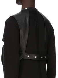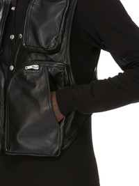 RICK OWENS FW25 CONCORDIANS CARGO VEST IN BLACK WAXY LAMB LEATHER THIS CARGO VEST IS ABOVE HIP LENGTH AND SLEEVELESS. IT HAS A DEEP V NECK WITH THREE FUNCTIONAL VISIBLE SNAP CLOSURES, AND SNAPS CONTINUING AROUND TO THE CENTRE BACK NECK. IT FEATURES ROUNDED BAUHAUS PANNIER POCKETS WITH ZIPS, TWO LARGE ON THE SIDE BODY, AND 2 SMALLER ONES EITHER SIDE OF THE CHEST. IT HAS LEVEL SHOULDER SEAMS AND AN OPEN BACK THAT SECURES WITH A CENTRE SNAP BELT. THIS LIGHTWEIGHT LAMB LEATHER IS FINISHED USING NATURAL WAXES AND ANILINE WHICH MAKES A SUPPLE HANDFEEL. BECAUSE THIS SKIN IS NAKED, NOT FINISHED USING ANY PIGMENTS COVERING THE SKIN, NATURAL MARKINGS AND SHADINGS ARE VISIBLE WHICH MAKES EACH SKIN AND PRODUCT UNIQUE. THIS TANNERY IS LWG AUDITED. COLOR: BLACK MATERIAL: 100% LAMB LEATHER LINING 100% COTTON PADDING 100% POLYESTER MODEL IS 189CM TALL MODEL WEARS SIZE 48