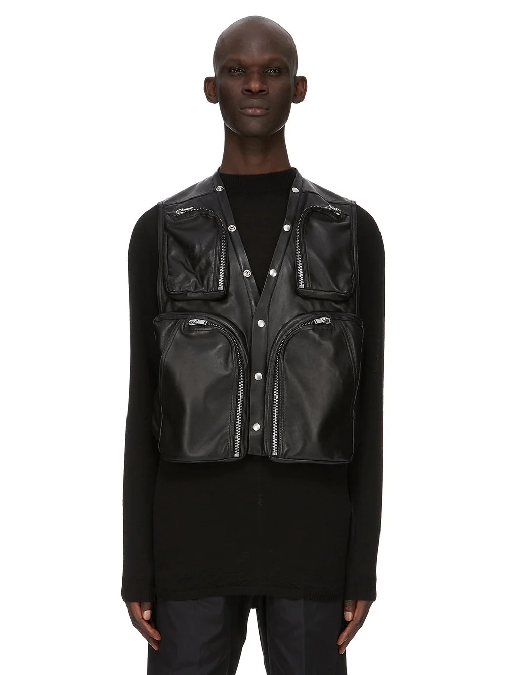 RICK OWENS FW25 CONCORDIANS CARGO VEST IN BLACK WAXY LAMB LEATHER THIS CARGO VEST IS ABOVE HIP LENGTH AND SLEEVELESS. IT HAS A DEEP V NECK WITH THREE FUNCTIONAL VISIBLE SNAP CLOSURES, AND SNAPS CONTINUING AROUND TO THE CENTRE BACK NECK. IT FEATURES ROUNDED BAUHAUS PANNIER POCKETS WITH ZIPS, TWO LARGE ON THE SIDE BODY, AND 2 SMALLER ONES EITHER SIDE OF THE CHEST. IT HAS LEVEL SHOULDER SEAMS AND AN OPEN BACK THAT SECURES WITH A CENTRE SNAP BELT THIS LIGHTWEIGHT LAMB LEATHER IS FINISHED USING NATURAL WAXES AND ANILINE WHICH MAKES A SUPPLE HANDFEEL BECAUSE THIS SKIN IS NAKED, NOT FINISHED USING ANY PIGMENTS COVERING THE SKIN, NATURAL MARKINGS AND SHADINGS ARE VISIBLE WHICH MAKES EACH SKIN AND PRODUCT UNIQUE THIS TANNERY IS LWG AUDITED COLOR: BLACK MATERIAL: 100% LAMB LEATHER LINING 100% COTTON PADDING 100% POLYESTER MODEL IS 189CM TALL MODEL WEARS SIZE 48