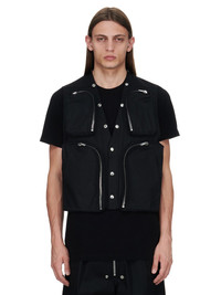 RICK OWENS FW24 PORTERVILLE CARGO VEST IN BLACK HEAVY COTTON POPLIN THIS CARGO VEST IS ABOVE HIP-LENGTH AND SLEEVELESS. IT HAS A DEEP V NECK WITH FOUR FUNCTIONAL VISIBLE SNAP CLOSURES, AND SNAPS CONTINUING AROUND TO THE CENTRE BACK NECK. IT FEATURES TWO, LARGE, ROUNDED BAUHAUS PANNIER POCKETS WITH ZIPPERS, ON THE SIDE BODY, AND 2 SMALLER POCKETS ON EITHER SIDE OF THE CHEST. IT HAS LEVEL SHOULDER SEAMS AND AN OPEN BACK THAT SECURES WITH A CENTRE SNAP BELT THIS MEDIUMWEIGHT COTTON POPLIN HAS A CRISP HANDFEEL AND WASHED FINISH THIS FABRIC IS MADE USING GOTS CERTIFIED ORGANIC COTTON WHICH MEANS THE NATURAL FIBER IS GROWN WITHOUT HARMFUL CHEMICALS, LEAVING OUR SOIL, AIR AND WATER CLEANER FROM CONTAMINATES - COLOR: BLACK - MATERIAL: 97% COTTON + 3% ELASTANE - POCKETS LINING 100% COTTON - MODEL IS 189CM TALL - MODEL WEARS SIZE 48
