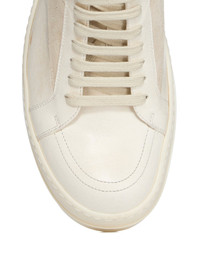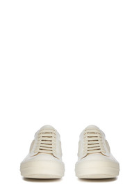 RICK OWENS FW25 CONCORDIANS VINTAGE SNEAKS IN MILK/MILK/MILK ALBINO LAMB LEATHER AND SUEDE LEATHER THESE VINTAGE SNEAKS ARE UNDER-ANKLE HEIGHT AND HAVE EIGHT EYELETS WITH LACES, TOE CAPS AND SHARK-TOOTHED BUMPER SOLES. THEY FEATURE A TRIANGULAR LEATHER APPLIQUE ON THE SIDE FOOT, A PADDED ANKLE AND CONTRAST STITCHING THIS A COMBINATION OF ALBINO LAMB LEATHER AND SUEDE LEATHER THIS MEDIUMWEIGHT ALBINO LAMB LEATHER HAS A NATURAL AND WAXY HANDFEEL TANNED IN THE NAPLES AREA OF ITALY, THIS LEATHER IS MADE ON A METAL FREE TANNED WHITE BASE, TUMBLED IN ORDER TO BRING OUT THE NATURAL GRAIN TEXTURE OF THE LEATHER AND FINISHED WITH NATURAL WAX BY HAND TO ACHIEVE THE IRREGULAR ALBINO COLORATION BECAUSE THIS SKIN IS NAKED, NOT FINISHED USING ANY PIGMENTS COVERING THE SKIN, NATURAL MARKINGS AND SHADINGS ARE VISIBLE WHICH MAKES EACH SKIN AND PRODUCT UNIQUE COLOR: MILK/MILK/MILK MATERIAL: UPPER 100% LAMB LEATHER LATERAL DETAILS 100% CALF LEATHER LINING 100% CALF LEATHER INSOLE 100% CALF LEATHER SOLE 100% THERMOPLASTIC RUBBER SOLE HEIGHT 3.5CM
