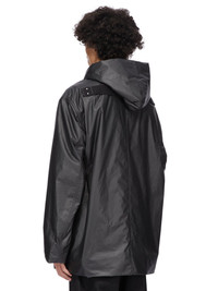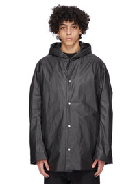 RICK OWENS FW25 CONCORDIANS RUNWAY CROPPED MAC IN BLACK COATED POPLIN THIS CROPPED MAC IS BELOW HIP LENGTH WITH LONG LOOSE SLEEVES. IT HAS A LARGE HOOD, LEVEL SHOULDER SEAMS AND CONCEALED SIDE SEAM POCKETS. IT FEATURES FRONT SNAP CLOSURES. IT HAS A COTTON WEBBING STRAP WITH RIVET DETAIL ON THE BACK YOKE. IT IS FULLY LINED AND HAS TWO INTERNAL ZIPPERED POCKETS THIS LIGHTWEIGHT COTTON POPLIN HAS A SEMI SHINY WATER REPELLENT WAX COATING AND A CRISPY HAND FEEL THIS FABRIC IS MADE USING GOTS CERTIFIED ORGANIC COTTON WHICH MEANS THE NATURAL FIBER IS GROWN WITHOUT HARMFUL CHEMICALS, LEAVING OUR SOIL, AIR AND WATER CLEANER FROM CONTAMINATES COLOR: BLACK MATERIAL: 93% COTTON + 7% POLYURETHANE MODEL IS 189CM TALL MODEL WEARS SIZE 48