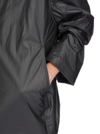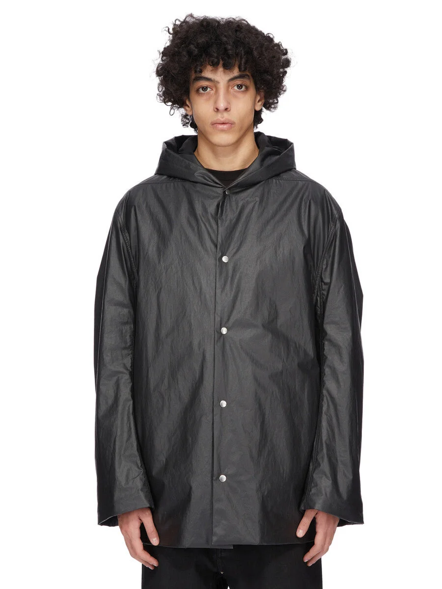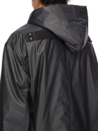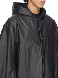 RICK OWENS FW25 CONCORDIANS RUNWAY CROPPED MAC IN BLACK COATED POPLIN THIS CROPPED MAC IS BELOW HIP LENGTH WITH LONG LOOSE SLEEVES. IT HAS A LARGE HOOD, LEVEL SHOULDER SEAMS AND CONCEALED SIDE SEAM POCKETS. IT FEATURES FRONT SNAP CLOSURES. IT HAS A COTTON WEBBING STRAP WITH RIVET DETAIL ON THE BACK YOKE. IT IS FULLY LINED AND HAS TWO INTERNAL ZIPPERED POCKETS. THIS LIGHTWEIGHT COTTON POPLIN HAS A SEMI SHINY WATER REPELLENT WAX COATING AND A CRISPY HAND FEEL. THIS FABRIC IS MADE USING GOTS CERTIFIED ORGANIC COTTON WHICH MEANS THE NATURAL FIBER IS GROWN WITHOUT HARMFUL CHEMICALS, LEAVING OUR SOIL, AIR AND WATER CLEANER FROM CONTAMINATES. COLOR: BLACK MATERIAL: 93% COTTON + 7% POLYURETHANE MODEL IS 189CM TALL MODEL WEARS SIZE 48