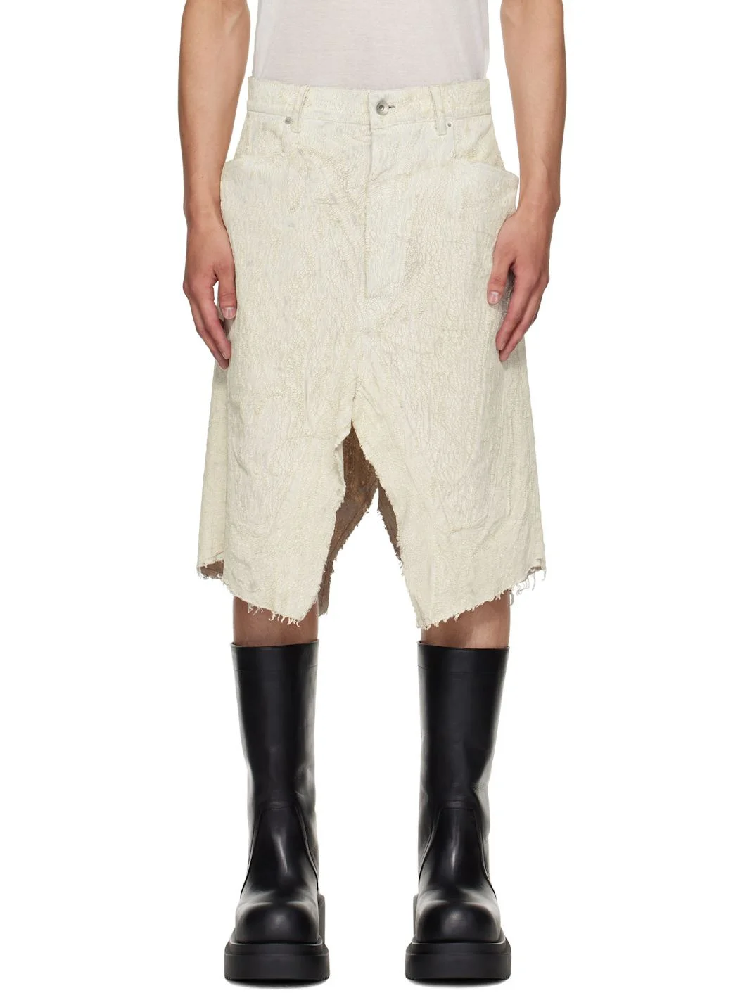 Non-stretch denim skirt. · Crackled hand-applied coating throughout · GOTS-certified organic cotton · Belt loops · Five-pocket styling · Central notch at front and back hem · Raw edge at hem Each item is unique. Please note coloration and finishings may vary slightly. Supplier color: Milk Body: 100% cotton. Pocket lining: 52% cotton, 48% polyester. Made in Italy 252232M193011