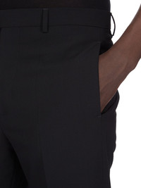 RICK OWENS SS25 HOLLYWOOD WIDE ASTAIRES IN BLACK LIGHT POUDRE THESE WIDE ASTAIRES LONG ARE FULL-LENGTH PANTS WITH A REGULAR CROTCH AND A SLIM CUT LEG THAT FLARES TO A WIDE BOOTCUT FROM THE KNEE. THEY HAVE A CLASSIC TAILORED WAISTBAND WITH WRAP AND CONCEALED BUTTON FLY, BELT LOOPS, 2 SIDE SLIT POCKETS, TWO BACK WELT POCKETS WITH BUTTONS, AND PRESSED CREASES ON THE FRONT AND BACK LEG THIS MEDIUMWEIGHT GRAIN DE POUDRE WOOL IS MATTE AND HAS A SOFT AND FLUID HAND FEEL COLOR: BLACK MATERIAL: 100% WOOL MODEL IS 189CM TALL MODEL WEARS SIZE 48