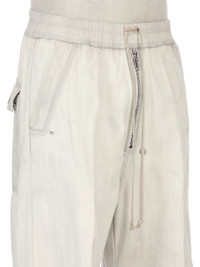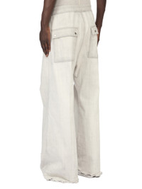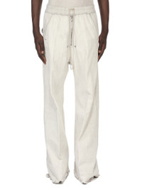 RICK OWENS SS26 TEMPLE WIDE BELA PANTS MILK WASH SHREDDED 13OZ MILK WASH DENIM THESE WIDE BELA PANTS ARE FULL-LENGTH WITH A LOW CROTCH AND WIDE LEG. THEY FEATURE AN ELASTICIZED WAISTBAND WITH DRAWSTRING AND A BELA EXPOSED CENTER ZIPPER WITH TWO SNAP DETAIL AT BOTTOM. THEY HAVE SIDE WELT POCKETS WITH RIVET AND EYELET DETAIL AND BACK POCKETS WITH FLAPS AND SNAP CLOSURES. THIS MEDIUMWEIGHT MILK WASH DENIM IS MADE ON A 13OZ JAPANESE BLACK AND NATURAL DENIM. THE READY GARMENT IS BLEACHED AND WASHED TO ACHIEVE THE DIRTY MILK COLOR AND SOFT HANDFEEL. THE SHREDDING IS MADE USING LASER. THIS GARMENT IS TREATED IN AN ITALIAN WASH HOUSE BASED IN THE VENETO AREA OF ITALY, THAT PRODUCES IN SMALLER TREATMENT BATHS TO REDUCE WATER WASTE AND UTILIZE A WATER PURIFYING PROCESS THAT ENABLES THEM TO RECYCLE A PORTION OF THE WATER USED. ALL OF OUR DENIM WASHES ARE ZDHC CERTIFIED. COLOR: MILK WASH MATERIAL: 100% COTTON BAND 91% COTTON + 6% ELASTOMULTIESTER + 3% RUBBER FIBERPOCKETS LINING 52% POLYESTER + 48% COTTON MODEL IS 189CM TALL MODEL WEARS SIZE 48